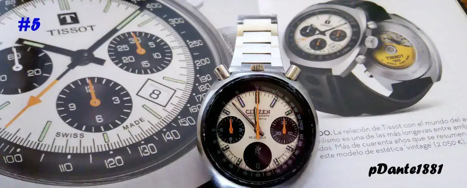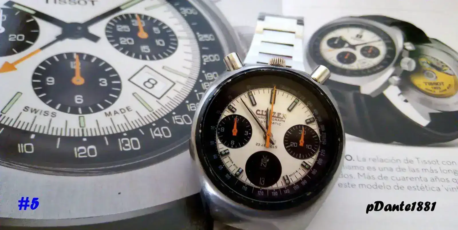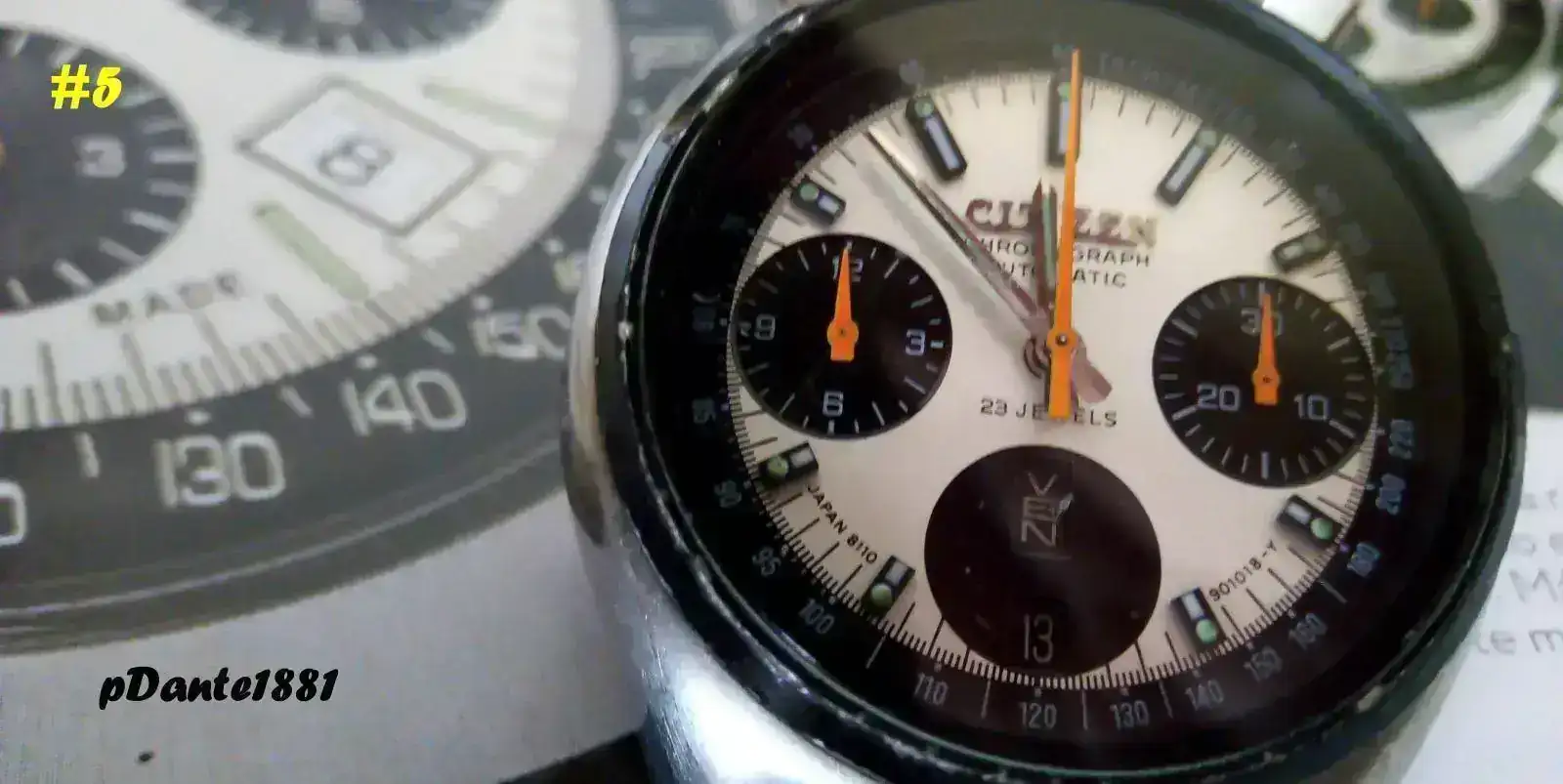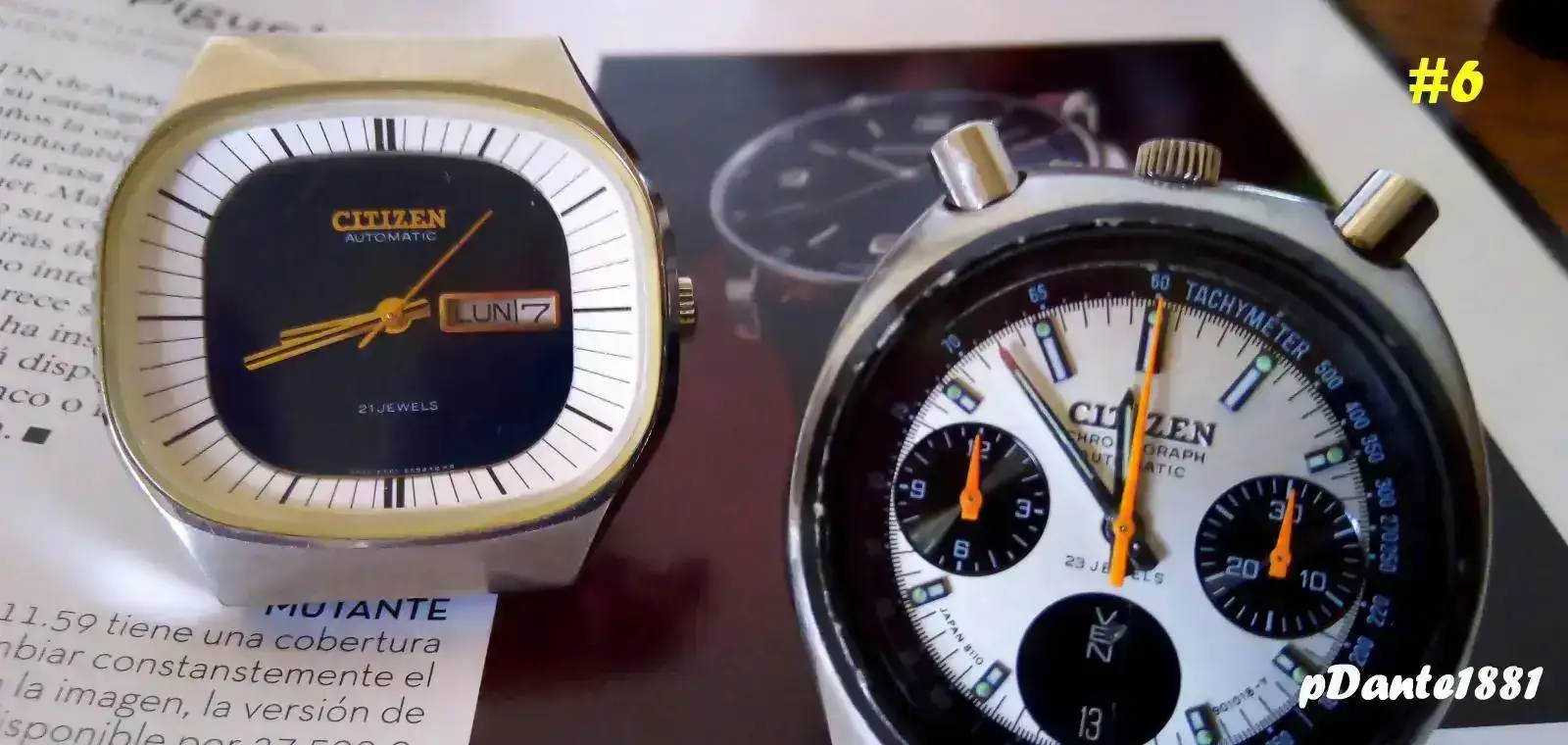 . Yo lo usé varios años en el trabajo por ser un regalo.5. CITIZEN Flyback chronograf 4-901053 Y Cal. 8110 23 jw. 28800 A/h. caja 38 mm. / 18 mm. en el fondo grabado 6N-4-5. Reloj de finales de 1972. Comprado por mí en el año 1973 y costó si mal no recuerdo entre 6300 y 6700 Ptas.
