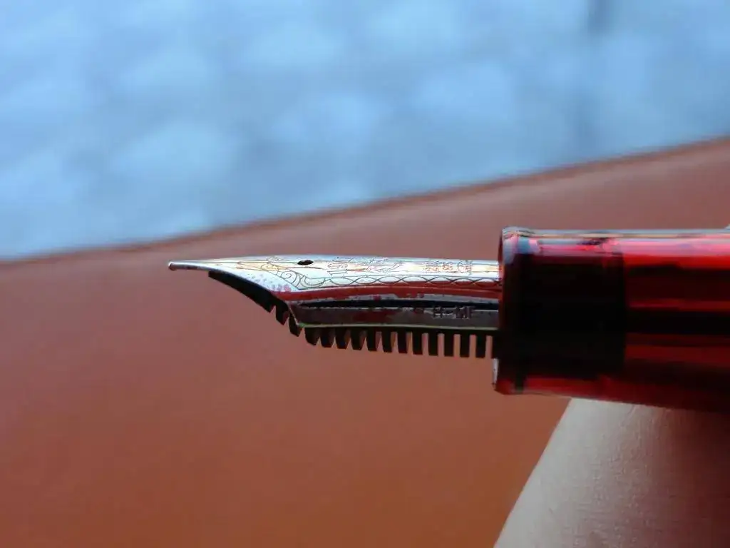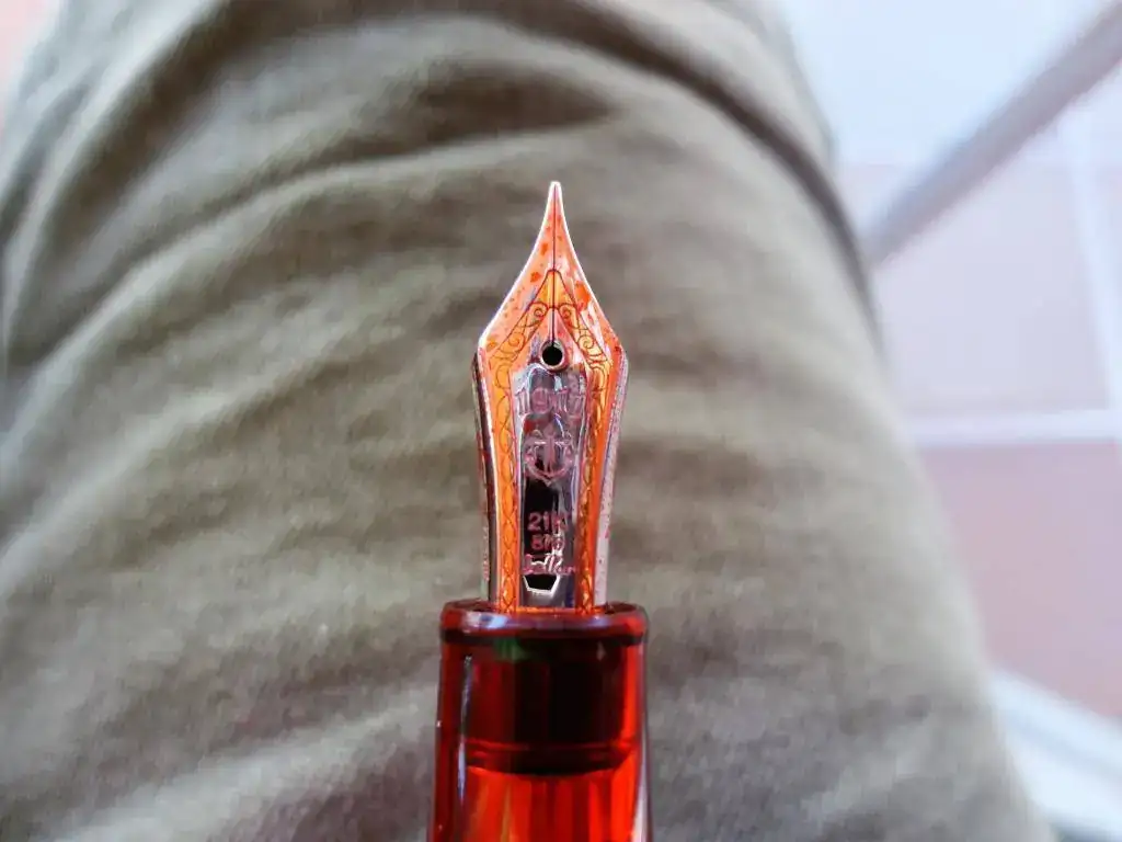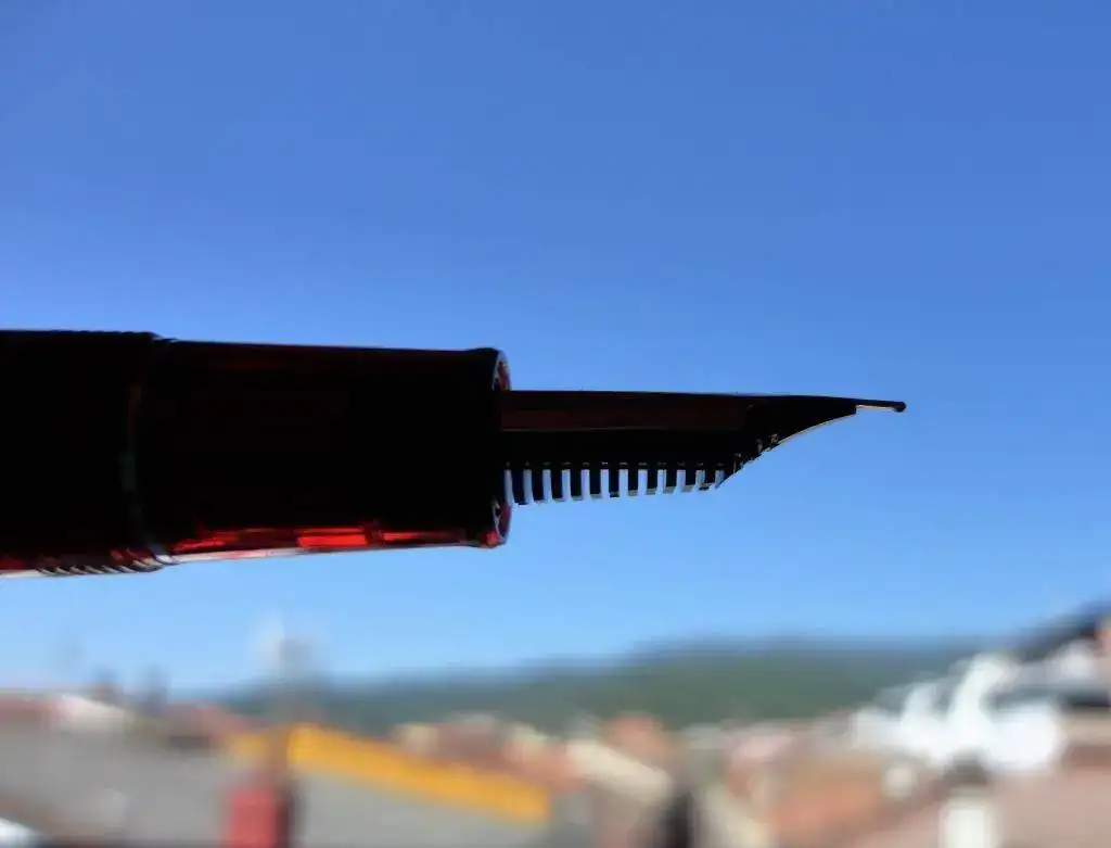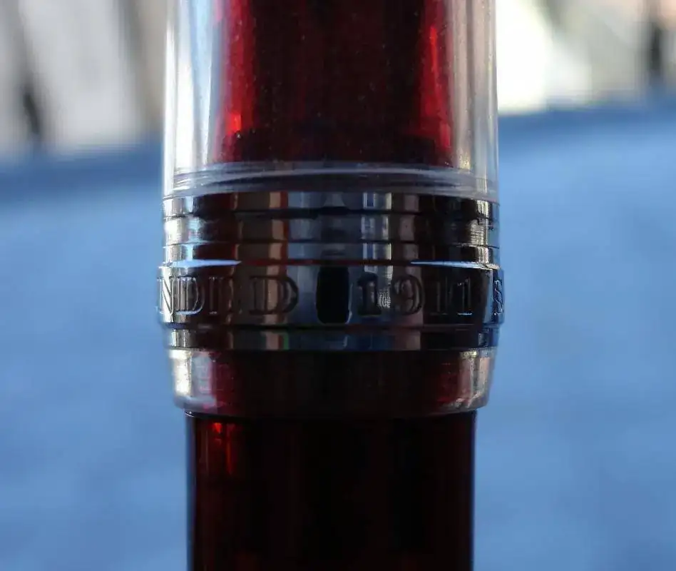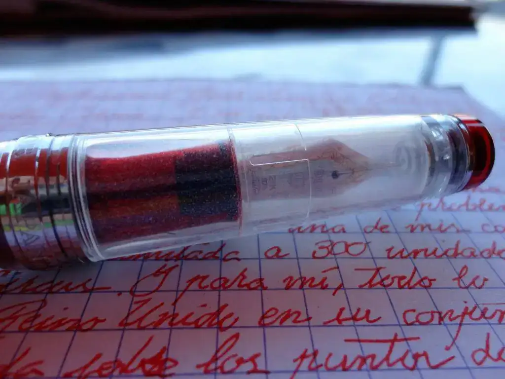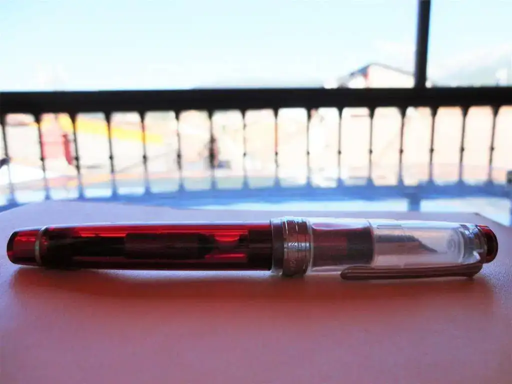 En cuanto a la pluma en sí, destaco su resina. Ya he dicho por ahí otras veces y siempre que tengo ocasión lo repito, que la resina de Sailor es densa, fuerte... da la sensación de que tienes algo sólido entre tus manos. Esto es algo que reprocho a Pelikan. Tengo dos M20X que me parecen frágiles, muy de plástico. Y la M605 que tengo igual, da la sensación de no ser una pluma de ese precio (aunque afortunadamente los plumines de Pelikan son muy buenos). En el caso de la Piccadilly Circus, he encontrado de todo: gente que adora el contraste entre el cuerpo y el capuchón y gente que lo odia. A mí me encanta que pase de un rojo traslúcido que te permite ver las tripas de la pluma a un capuchón casi transparente que representa las burbujas de la bebida en cuestión. En cuanto a la zona de agarre, es algo más ancha que la Sapporo, y se nota. Me costó algo acostumbrarme, aunque ahora es una delicia. El plumín es de 21K, algo que no se creo que se traduzca en mejor calidad puesto que los mejores plumines suelen ser de 14 o 18K. Supongo que será marketing... Un plumín de oro casi puro puede tener el inconveniente de que se doble y no vuelva a su posición. Sin embargo, este plumín parece bastante duro. Es más grande que el una Sapporo y menos que el de una King of Pen y en mi caso, es bicolor, rodiado con la franja dorada.