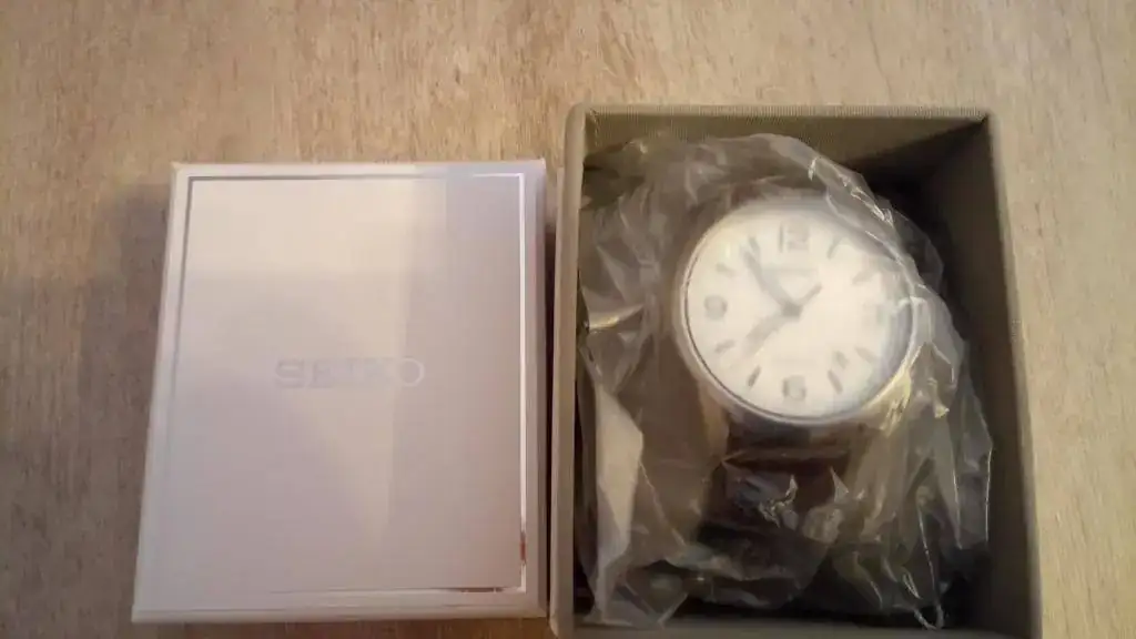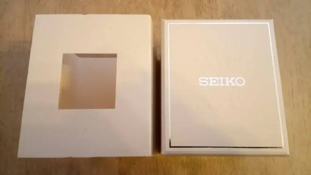 En muchas de las webs donde sale este reloj se dice que es una edición limitada (junto con su hermano de esfera y correa negras), pero el reloj no lo pone por ningún lado, ni en la etiqueta donde pone que es un Presage, así que preguntaré directamente a Seiko a ver qué me dicen. La caja en la que viene es muy sencilla (típico de Seiko), aunque no es ninguna de las que acostumbramos a ver en España; aunque quizás sea porque es un Made in Japan y viene de CW.