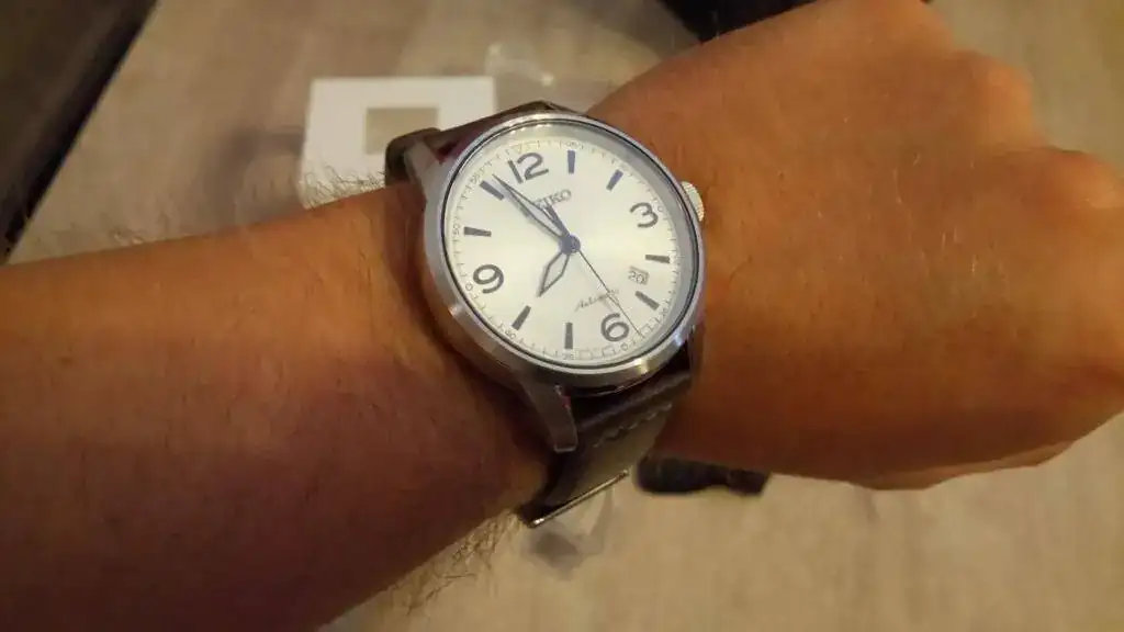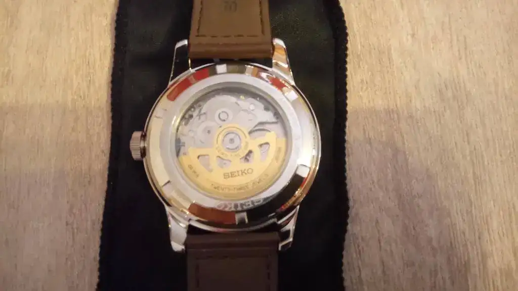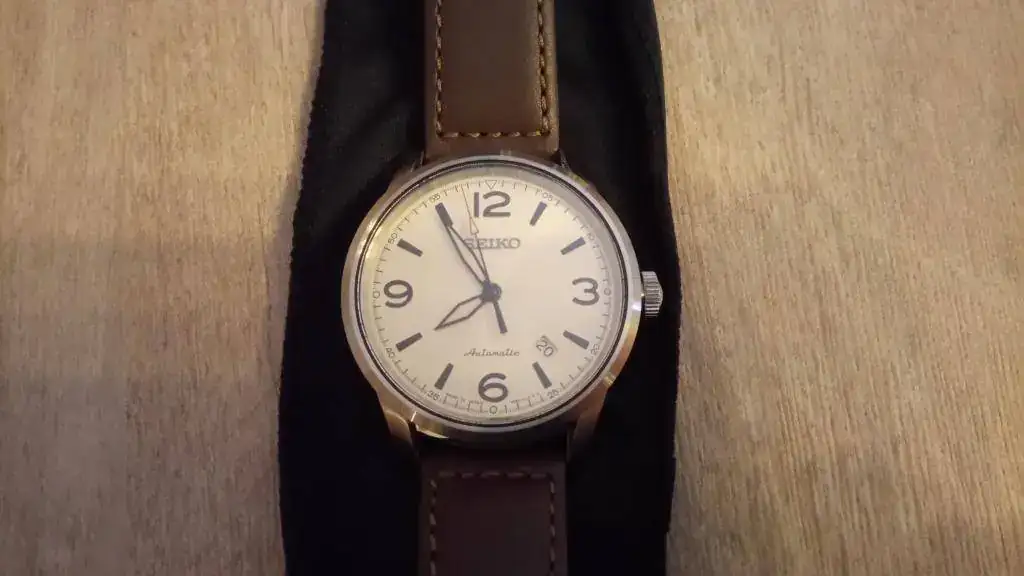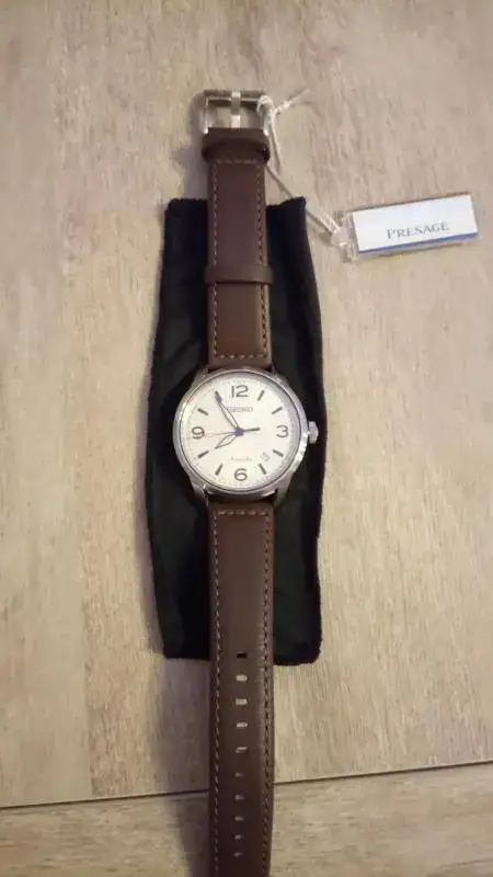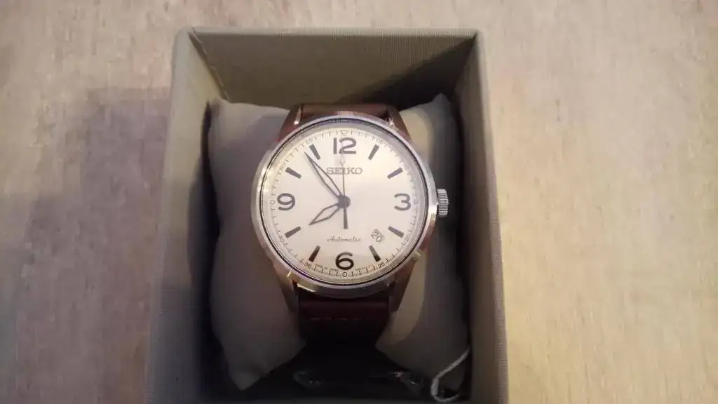 En cuanto a las características del reloj, son las siguientes: caja de acero de 42mm, calibre 4R35 (es el 4R36 sin el día de la semana), cristal de zafiro, fondo visto, masa oscilante en dorado, correa de piel marrón, WR100m, esfera color crema "brillante" y MADE IN JAPAN. El diseño recuerda al SARG009, pero sin llegar al nivel de calidad de éste. De todas formas, para el uso que le voy a dar me es más que suficiente.