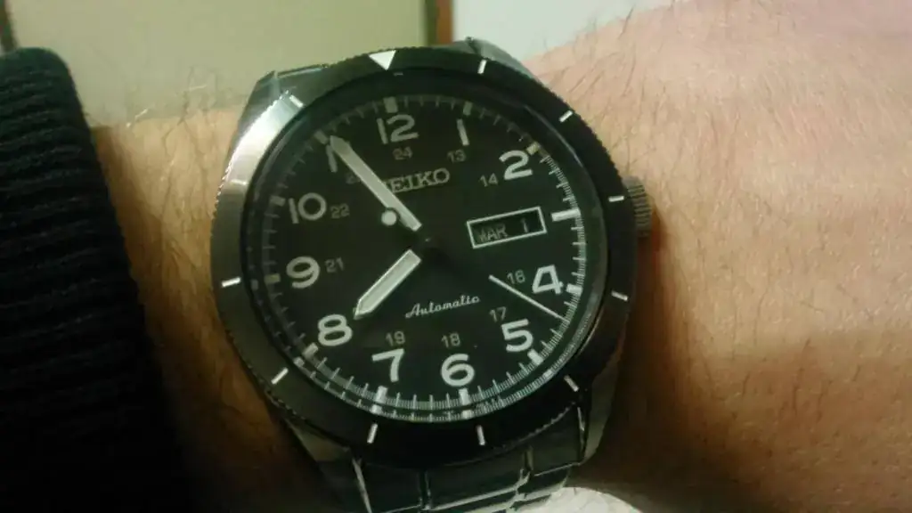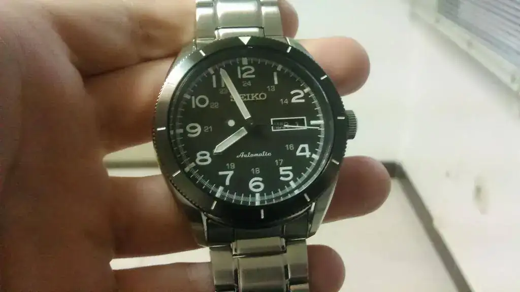 Del reloj decir que tiene un diámetro de 43mm sin corona, caja y brazalete de acero con partes pulidas y otras cepilladas, bisel cepillado en color antracita, esfera negra, cristal Hardlex abombado, fondo visto, eslabones sólidos, terminales de chapa doblada y cierre con doble pulsador. Monta el movimiento 4R36A de Seiko, con 40h de reserva, parada de segundero y remonte manual. Es 100m WR.