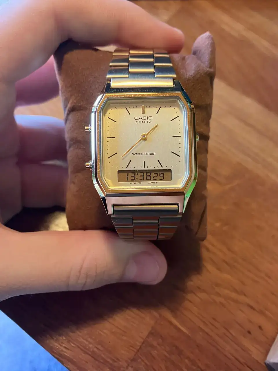 El segundo reloj es un Casio AQ-230GA. Era un Casio que me tuvo bastante tiempo con ganas de comprarlo, pero en la página oficial estaba agotado y dudaba de si comprarlo. Al final de tanto ojear ese estilo de Casio me acabé decidiendo (en parte porque me salían muchos anuncios y reels de instagram de los Casio AQ) y lo compré en una página de Singapur algo sospechosa (creationwatches.com), pues el reloj cuesta unos 60-70€ y lo compré por 43€, pero que según algunos foros de Reddit es legit. Igualmente me llegó bien, con caja y papeles cosa que tampoco es que me importe mucho siendo el reloj que es y por su precio, pero se agradece. Aún así no me acaba de convencer la página y no compraría ningún reloj caro en ella, tiene precios sospechosamente bajos.