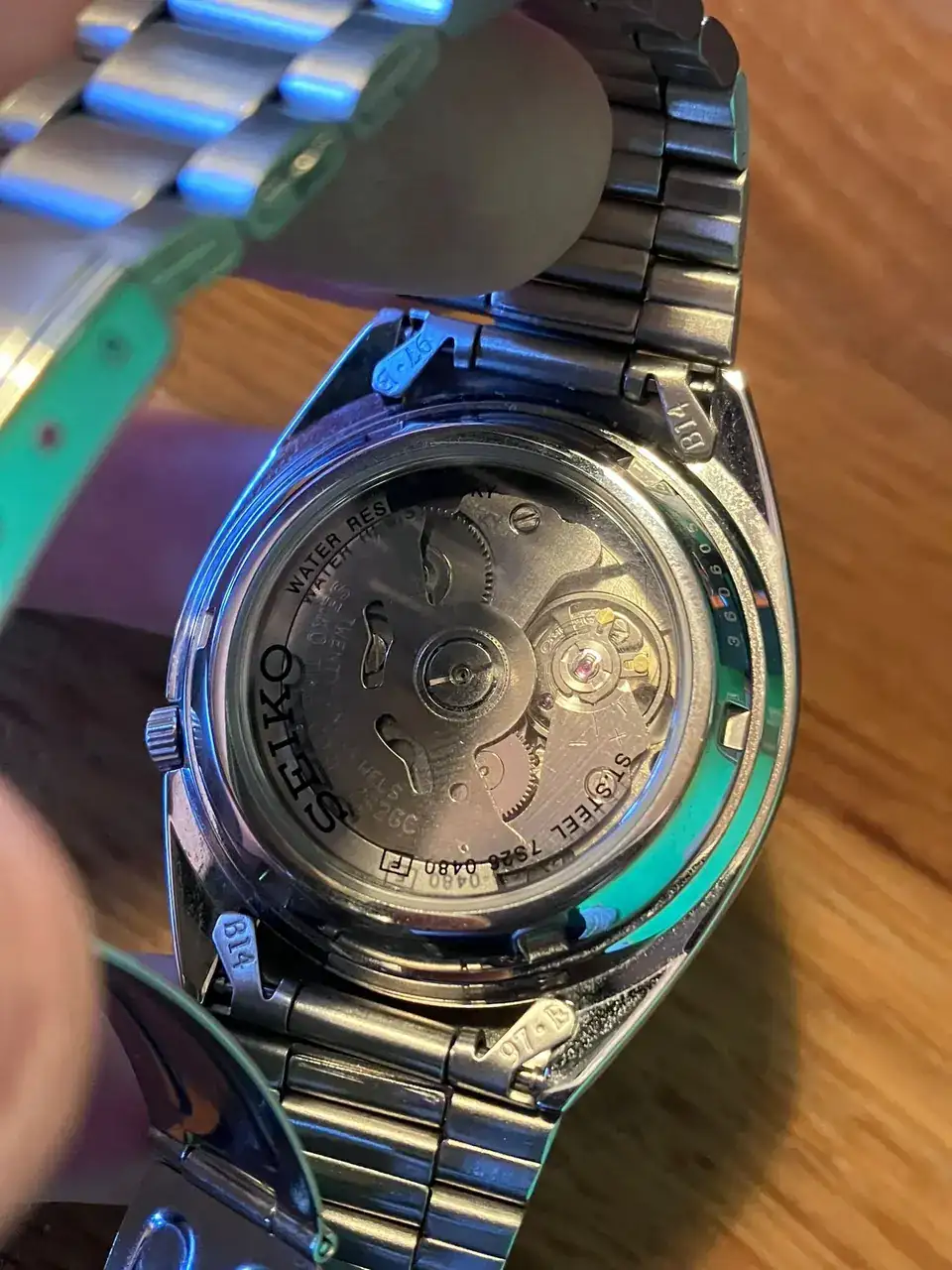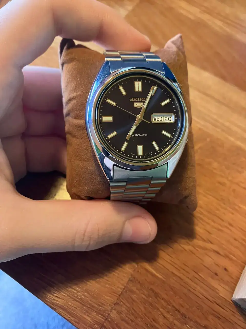 El tercer reloj es mi primer reloj automático, al cual le tengo cariño por eso. Es un Seiko 5 SNXS73K. Lo de la foto es un pelo, el cristal está intacto 😅. Es cómodo, relativamente preciso para el precio que pagas por él, y muy bonito.