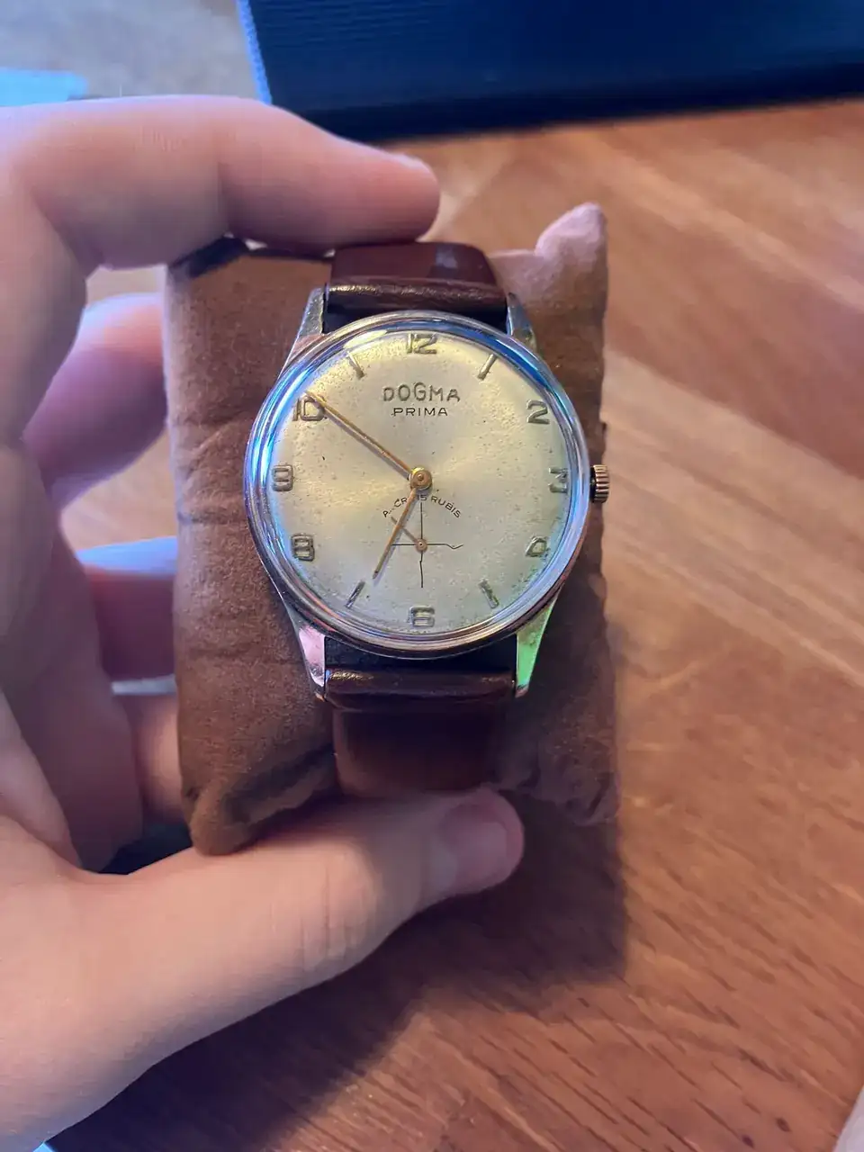 Probablemente el que menos use y el que peor funciona, el Dogma Prima de mi abuelo por parte de padre. Tiene mucho uso, era su único reloj y lo usaba cuando iba más elegante. Fue concejal del PCE en las primeras y creo que segundas elecciones tras la transición, por lo que era un reloj que usaba mucho al tener que ir de traje. Le tengo cariño pero de mis abuelos es el que menos me gusta.