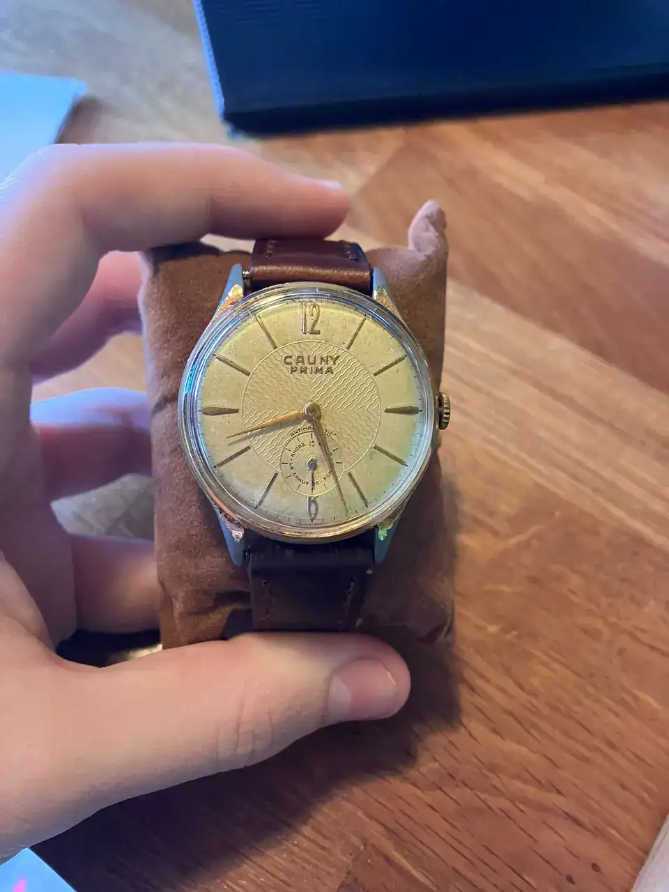 El Cauny Prima de mi abuelo por parte de madre, el único abuelo que conservo y que me lo regaló pese a ser su reloj favorito. Lo compró con su primer sueldo en la única joyería que había en el momento en Tapia de Casariego (en el occidente de Asturias). Creo que es de los años 40. Funciona sorprendentemente bien, y se conserva en "perfectas" condiciones para ser un reloj tan viejo y con tantísimos años de uso. Le tengo mucho aprecio por la historia que tiene y porque es de sus únicos relojes buenos (si no el único), el cabrón tiene un montón de relojes falsos y homenajes que compró hace décadas.