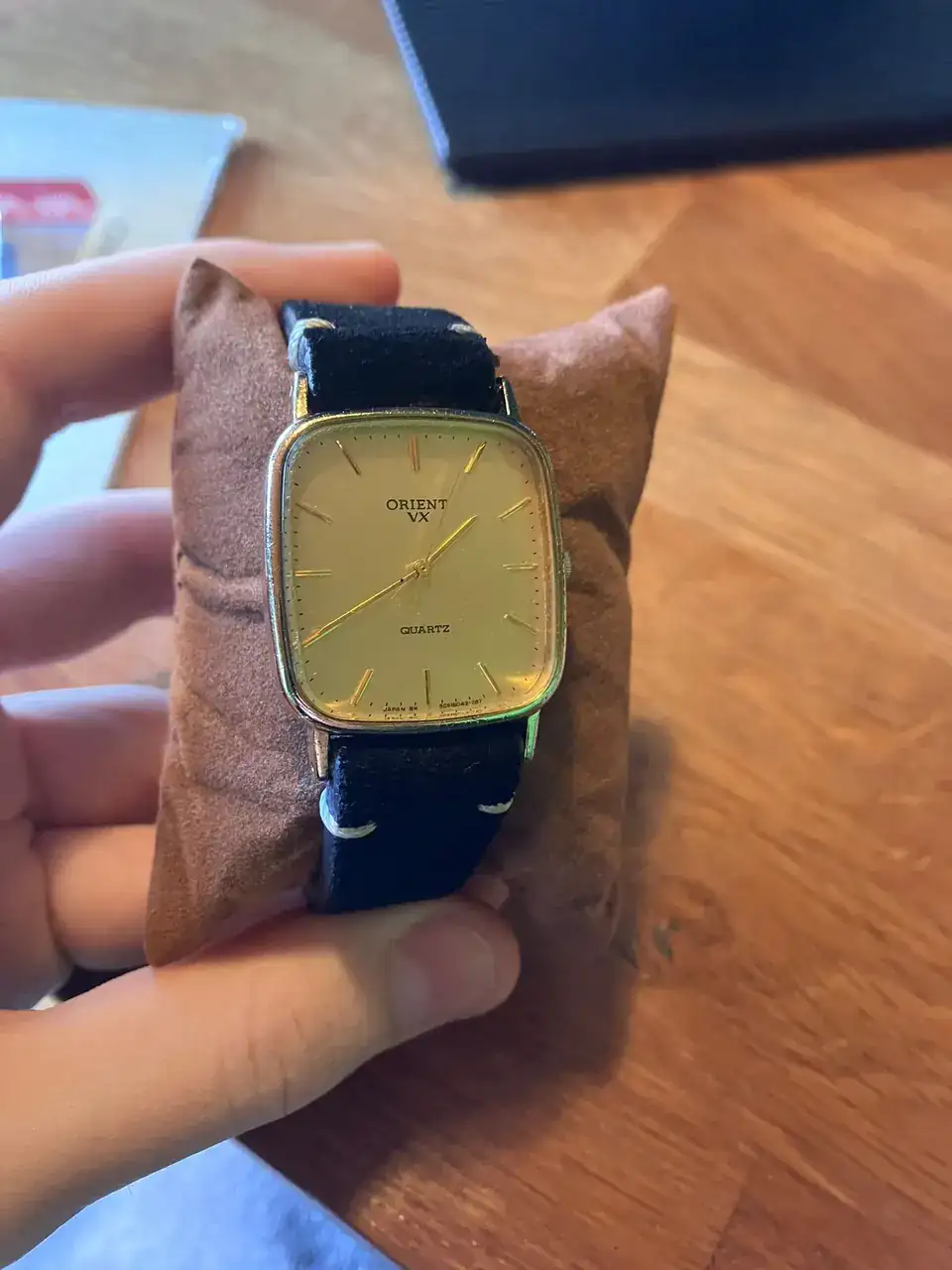 ).Este Orient VX que ahora lo tiene prestado mi novia es estéticamente de mis relojes favoritos porque me encantan los relojes más femeninos y pequeños estilo Cartier Tank y demás. Es de cuarzo y pese a tener un montón de años es muy muy exacto. Era del hermano de la madrina de mi hermana, que ya no usa relojes.