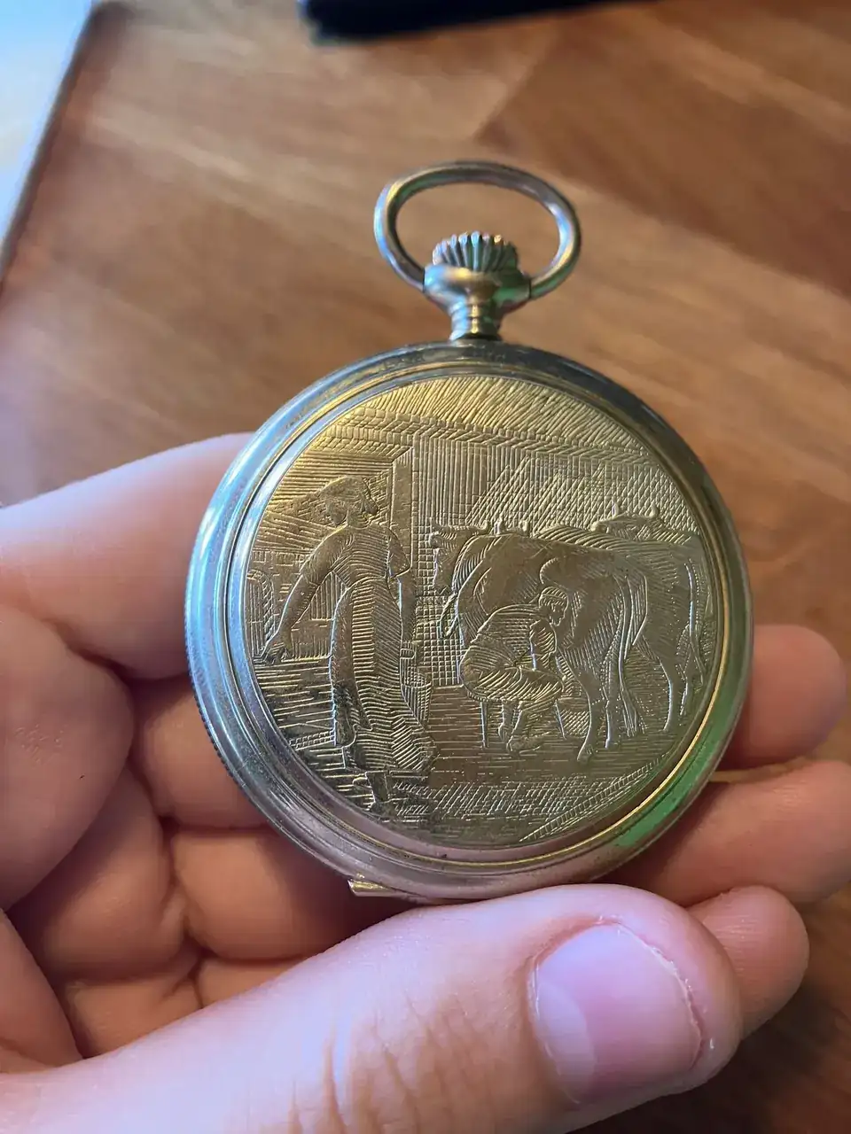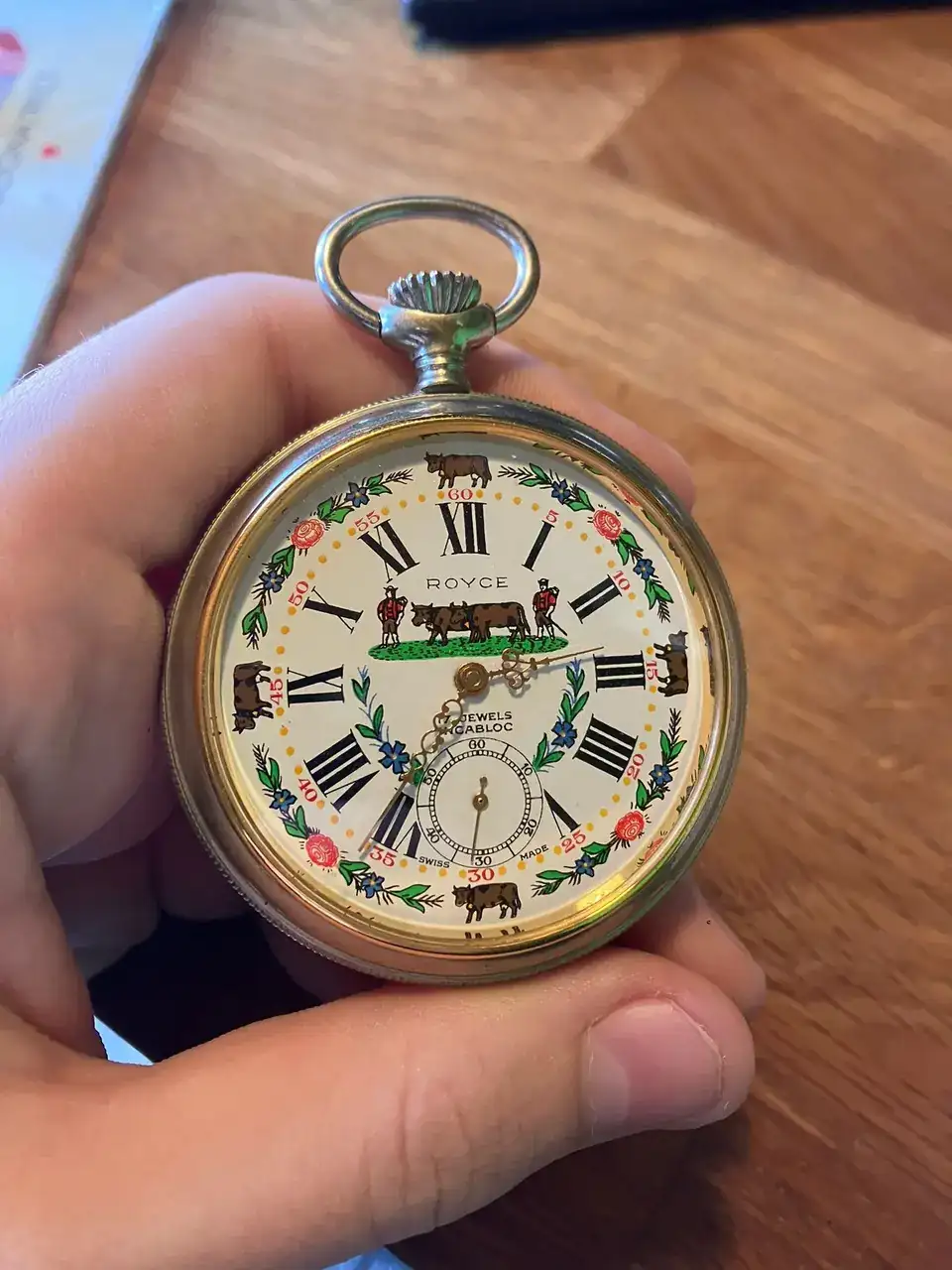 Un Royce Incabloc de cuerda y de bolsillo que era del padre de la madrina de mi hermana, no me supo dar ninguna información sobre él. Tiene bastantes años y tiene un diseño bastante común por lo que encontré en internet si buscas "pocket watch royce incabloc 17 jewels farmer design". Para mi gusto es bastante hortera pero es gracioso y divertido, por ahora no molesta en la caja pero si la lleno le buscaré otra caja. Siendo sincero no es para nada un reloj que vaya a usar nunca en mi vida a no ser que me disfrace de granjero o algo así. Es una pieza diferente, sin más.