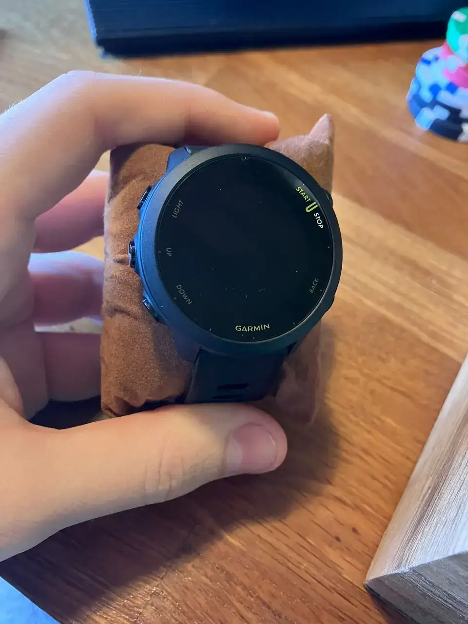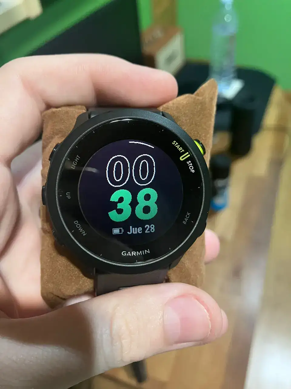 Por último, que tampoco es que sea necesario añadirlo aquí pero bueno, lo pongo porque suele estar en la caja, mi Garmin Forerunner 55. De los Garmin más baratos, pero está bastante bien para lo que lo utilizo yo (cuando salgo a correr y cuando voy a nadar), siendo bastante deportista pero para nada profesional por lo que no necesito tampoco una precisión milimétrica. Sin más, es más una pieza tecnológica más que horológica.