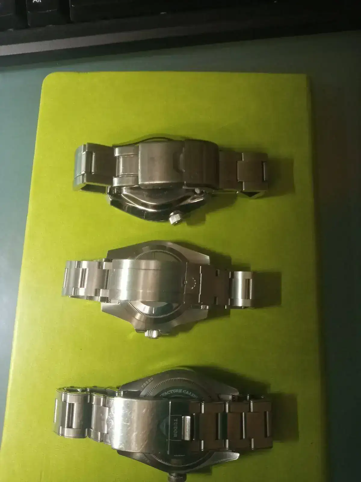 El Rolex con su bisel mítico de 40 mm, el Tudor con 41, y el MM con casi 43.