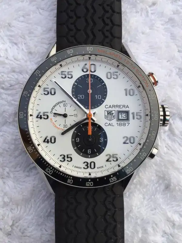 El contraste entre el bisel cerámico negro con el grabado "McLaren 1974 Edition" en naranja, la esfera blanca (aunque Tag diga "plata opalina", en mi tierra esto es blanco...) las subesferas de minutos y horas en negro texturizados y la trotadora naranja es increible: