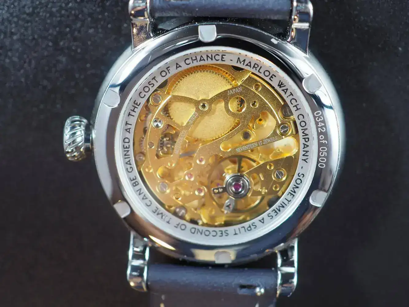 De tamaño contenido, 38mm de diámetro y 11mm de altura, lleva dentro un movimiento manual Miyota, el 6T33, con frecuencia de 28.800vph, dando un recorrido muy suave al segundero. Son movimientos algo difíciles de conseguir, y me tuve que conformar con la versión plateada en vez de la dorada, que ya no quedaba. Aún así, es un movimiento esqueletizado muy bonito. Muy suave al darle cuerda, y muy notable el tope para evitar disgustos.