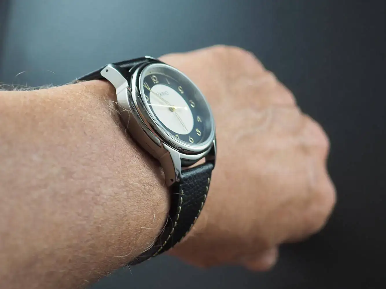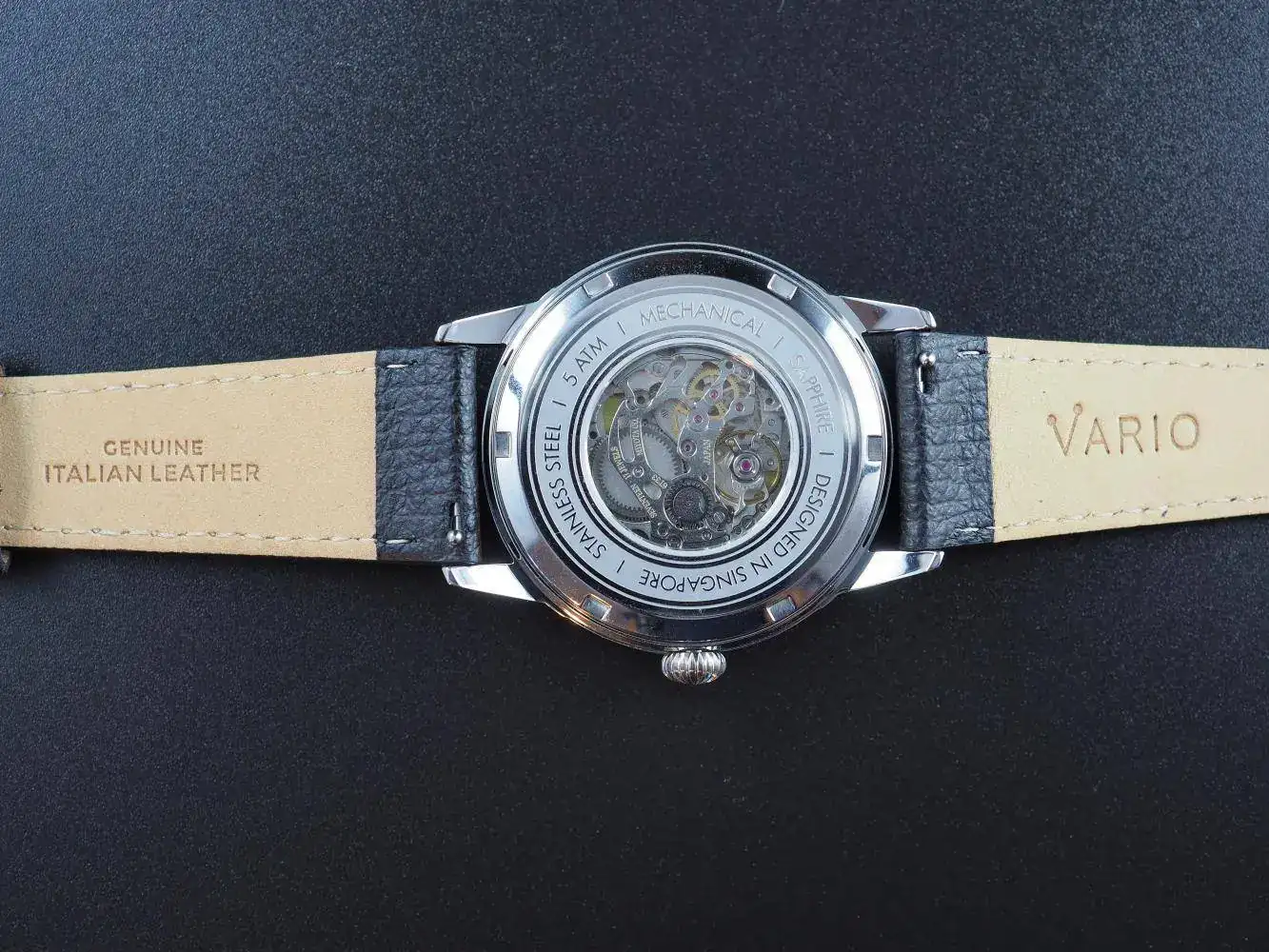 El fabricante, Vario, de Singapur, empezó fabricando y vendiendo correas, y la correa de piel de este reloj me parece perfecta: suave, de buen aspecto y muy bien acabada. Este Empire es ya el segundo reloj de la empresa.