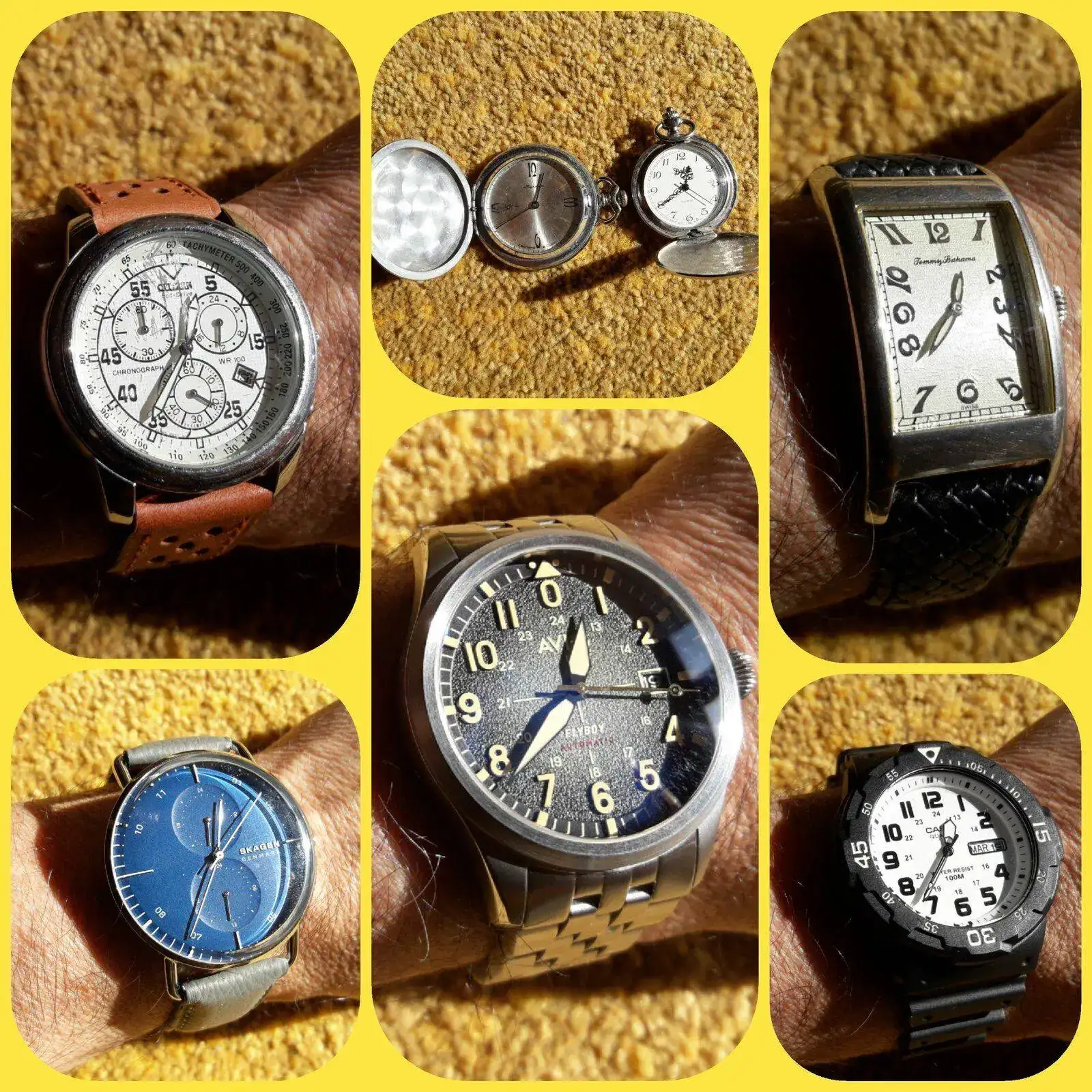 Soy un bilbaino amadrileñeándose desde hace casi catorce años. Toda mi vida me han fascinado los relojes y el mundo de la horología, pero nunca había pasado de alguna lectura aislada al respecto, conversaciones jugosas con amigos que saben mucho más que yo y el disfrute de mi modestísima "cuadrilla" que me permito enseñaros (curiosamente es la primera vez que los veo juntos en una foto). Es cierto que ante algunas de las colecciones que nos permitís disfrutar por aquí son muy modestos, pero son familia, me aportan un placer diario y para mi no palidecen ante ningún otro (no sería de Bilbao si no os dijera que son los "mejores relojes del mundo"). Desde el senior Molnija de los sesenta de mi padre hasta el último en llegar, esa preciosidad de FLyboy regalo de mi mujer, todos tienen historias biográficas enredadas en su movimiento y son, para mí, el recordatorio cotidiano en muñeca y mano de la infinita importancia de lo que alguien llamó "el DIos de las pequeñas cosas".
