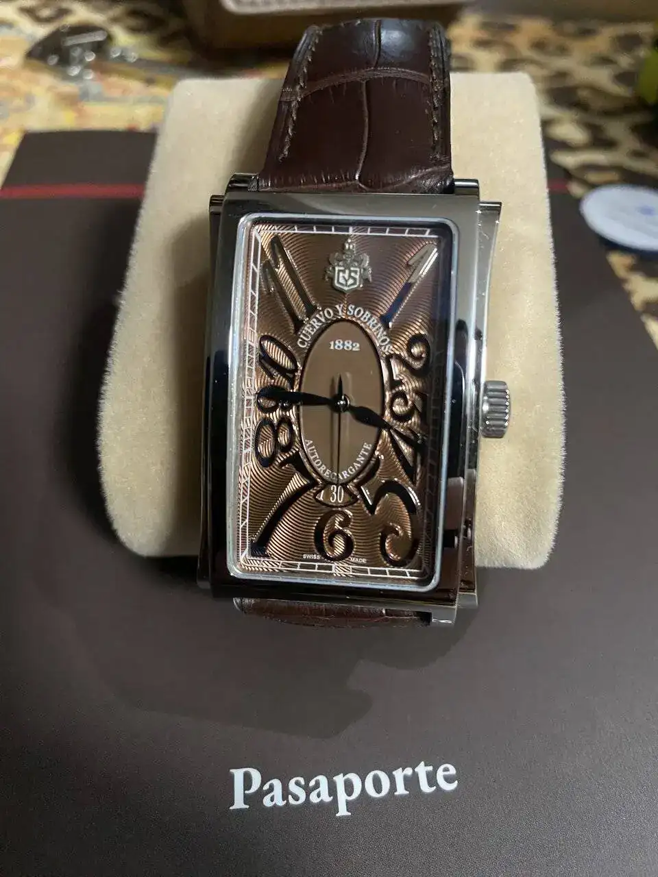 Me gustaría compartir con vosotros mi ultima adquisición. Me encanta, no solo por la pieza en si, sino porque es una marca solo conocida por verdaderos aficionados a la relojería y sobre todo por la historia con orígenes españoles de la marca. Me refiero a Cuervo y Sobrinos. Concretamente es el modelo Prominente y si me ha gustado el reloj, aún me ha gustado más la caja de presentación, una caja de puros autentica hecha de madera de raíz de nogal, una autentica maravilla.