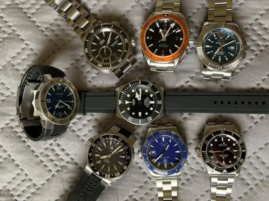 Por ultimo les dejo una foto con sus demáss compañeros: Oris Diver GMT, Oris Small Second C, Tag Aquaracer 500, Rolex Submariner, Omega Planet Ocean, Breitloing Colt 200m y el Mido Ocean Star Diver
