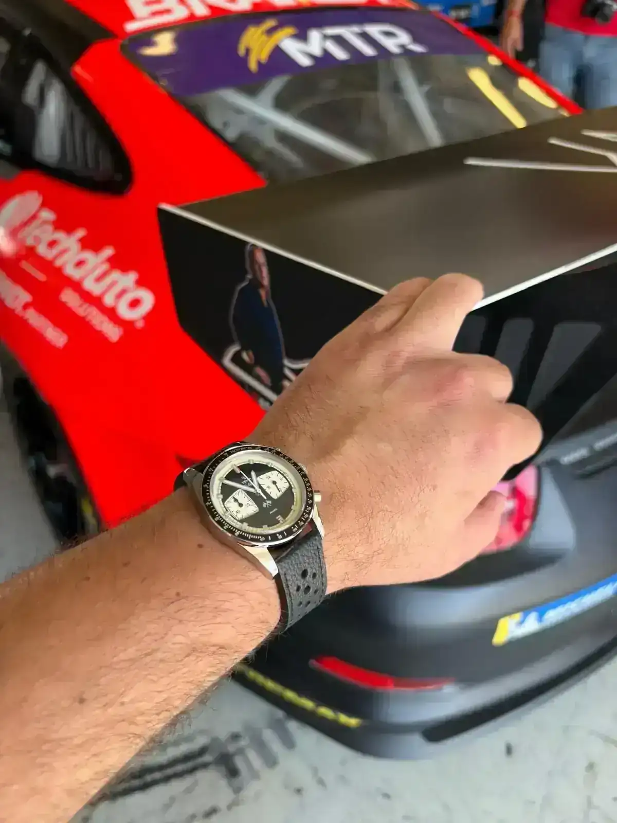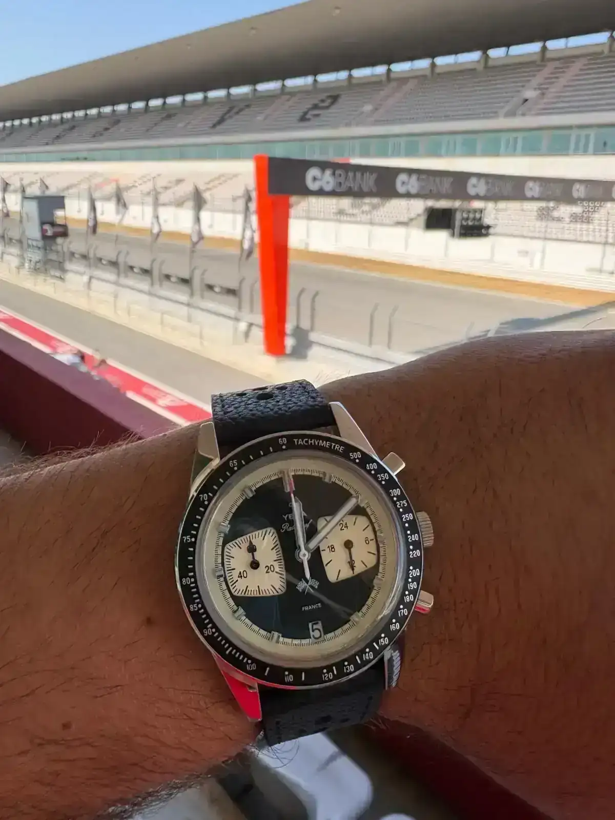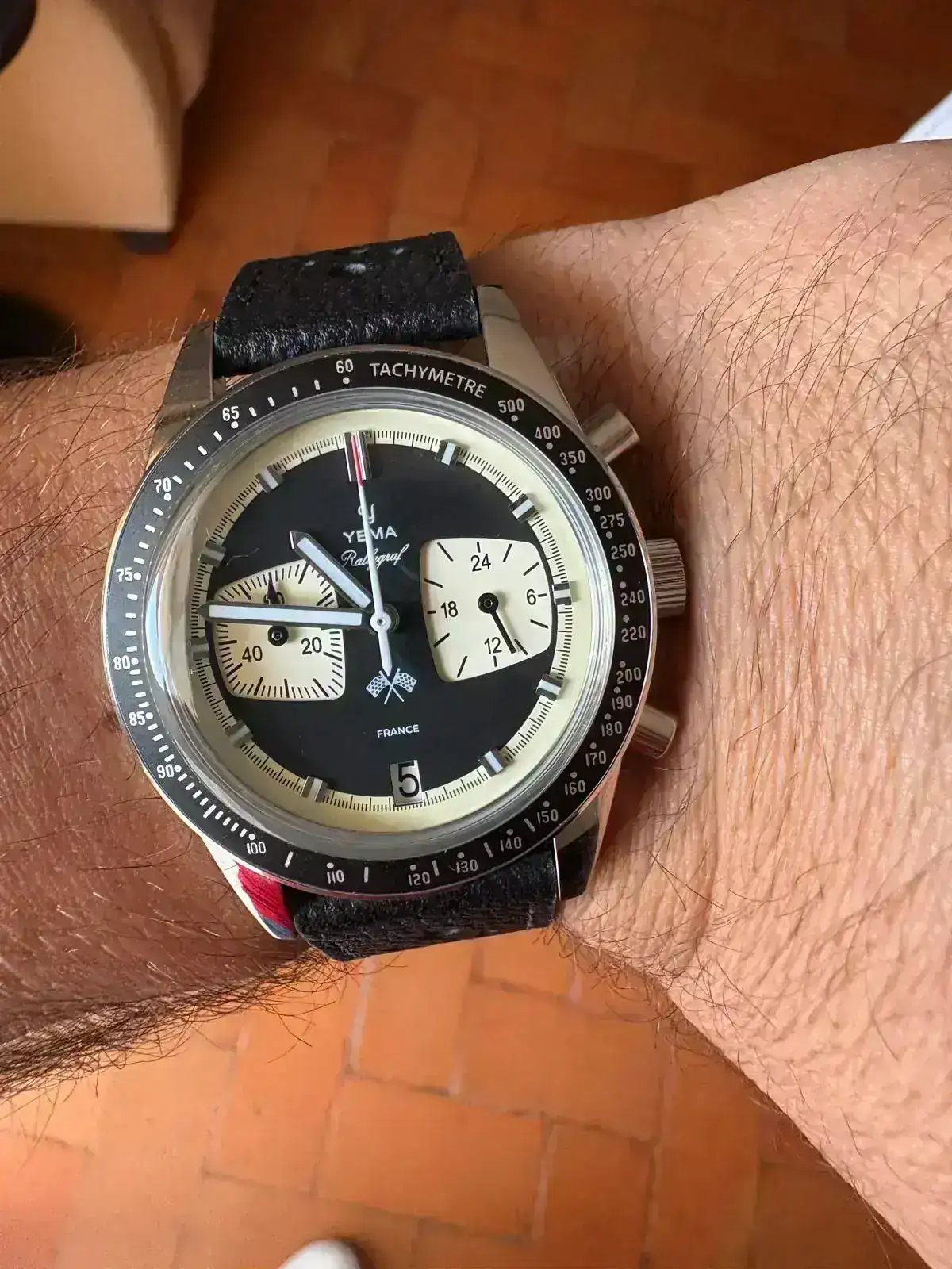 Este creo que lo enseñé el otro dia, en un hilo sobre la utilidad o no de los cronografos. Es el Yema Rallygraf. Es un Meca-Quarzt. Empece a leer sobre estos calibre hibridos, me fui intersando cada vez mas, y ya sabeis. Al final cayo este. Me gusta sobre todo la estetica retro y la forma en la que imita a los diseños de los coches clasicos (De los que soy un enamorado). Tengo que decir, que ssolo le encuentro un pequeño fallo (a mi parecer). El que la segundera permanezca siempre quieta (hasta que se activa la funicon crono) no termina de convencerme. Muchas veces cuando lo miro me da la sensacion de que esta parado. Por lo demas, poco mas que decir, me parece precioso, muy bien terminado y muy comodo. Calibre hibrido VK64 de Seiko y 39 de diametro.