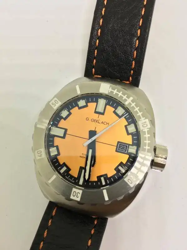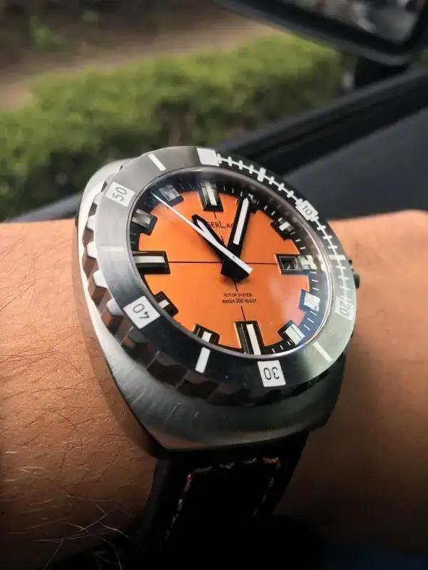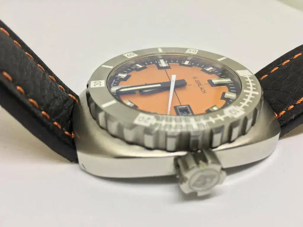 El dial es color naranja cobrizo muy diferente, me pareciera que rinde homenaje a los doxa de los 70's.