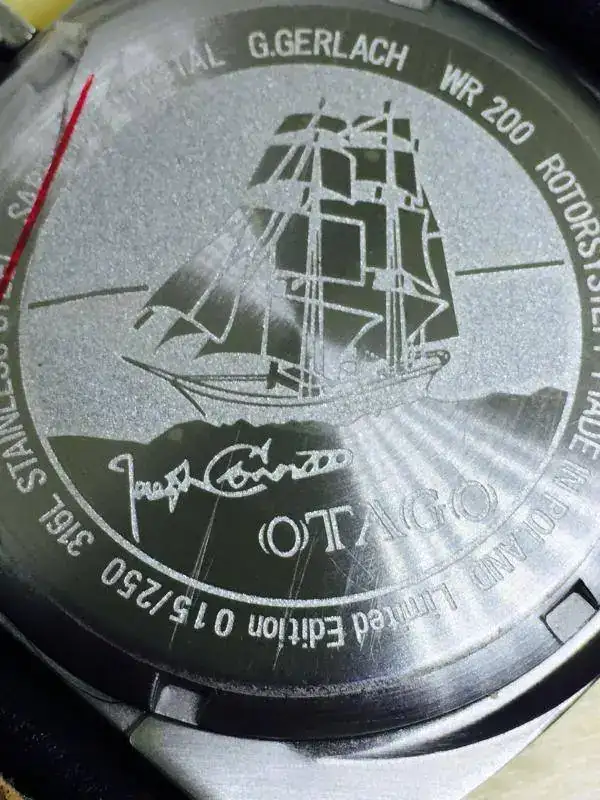 El grabado es otra de las cosas sobresalientes, tiene el OTAGO y la firma de Joseph Conrad, olvide mencionar que el reloj rinde homenaje al barco OTAGO del capitan Joshep, literatura polaca. Perdon por repetir tanta palabra