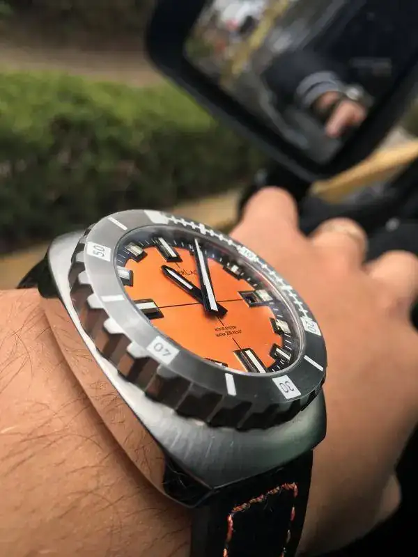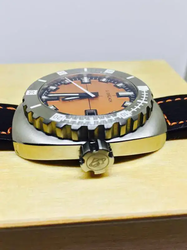 El grabado tiene alto nivel de detalle, cosa que no cualquier reloj de este rango de precio tiene. Limitado a 250 piezas en cada color.El dial es color naranja cobrizo muy diferente, me pareciera que rinde homenaje a los doxa de los 70's.