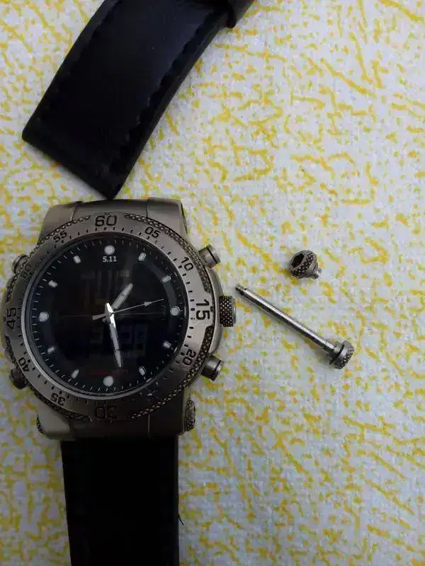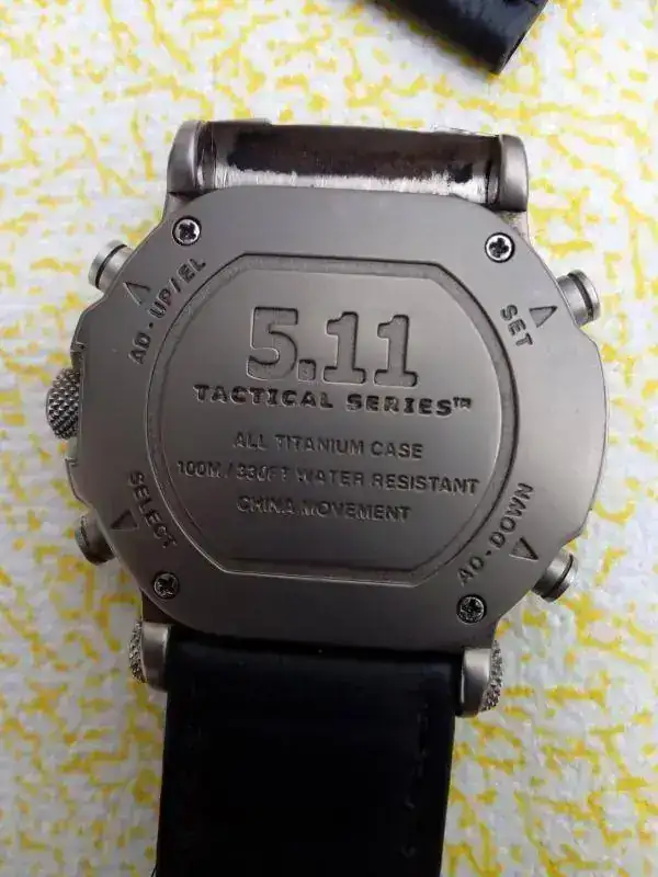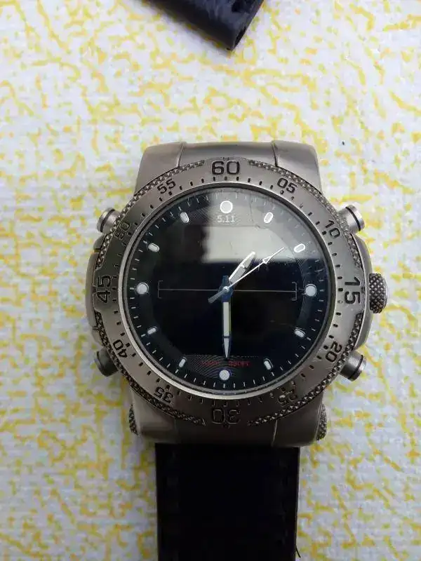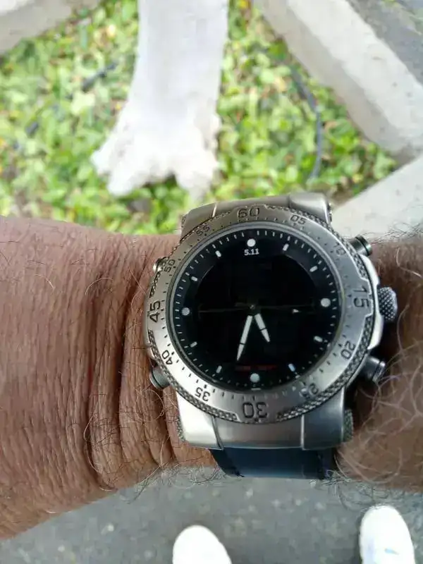 Se trata de un reloj tactico 5.11.Es un reloj anadigi,muy contundente,mide 47X54 mm,y su caja tiene de altura 15mm,podeis pensar que es descomunal para una muñeca pequeña como la mia,pero no es asi,esto sumado a su poco peso debido a que es todo de titanio,hace que sea muy llevadero.