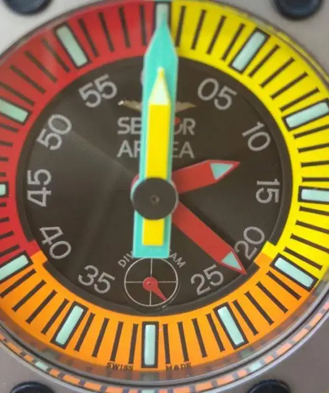 lleva 5 ajugas, las rojas marcan la hora y los minutos, en el crono esta la azul para los minutos y la amarila para los segundos y el segundero de la hora el mas pequeño debajo, en el dial tan colorido esta el profundimetro cromatico..osea, vas bajando de profundidad y los colores segun los metros van apagandose, la zona amarilla marca hasta los 20mt, luego ya la zona de advertencia en naranja y la zona peligrosa en rojo( no creo que pase nunca de la amarilla pero espero que si