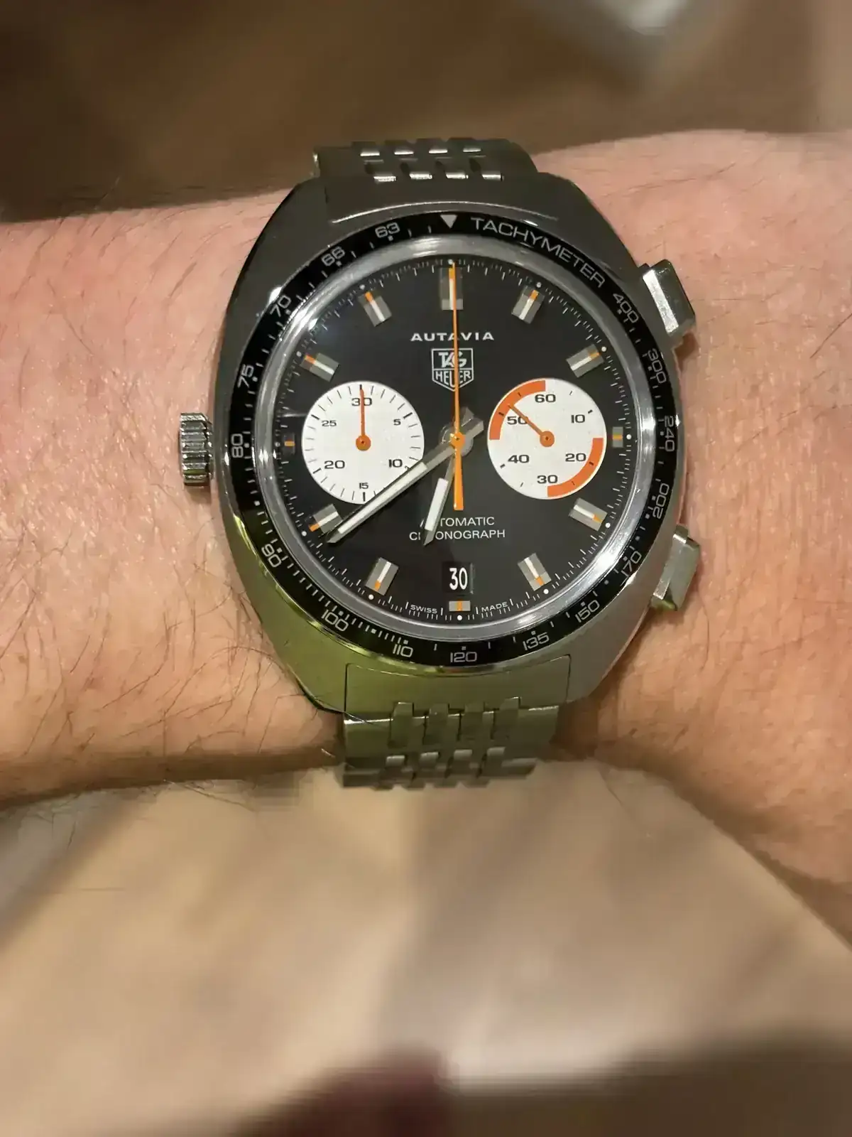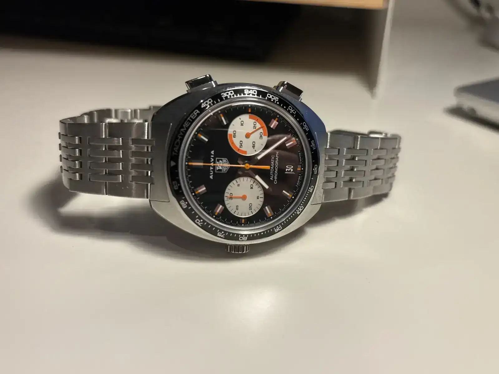 Pues aquí os presento mi última adquisición, un TH Autavia de 2004. En este caso la versión CY2111 que es la que tiene fondo negro. La verdad es que los relojes con fondo negro y detalles naranjas como este o el Speedmaster Mark II encuentro que le dan un toque deportivo que queda francamente bien.