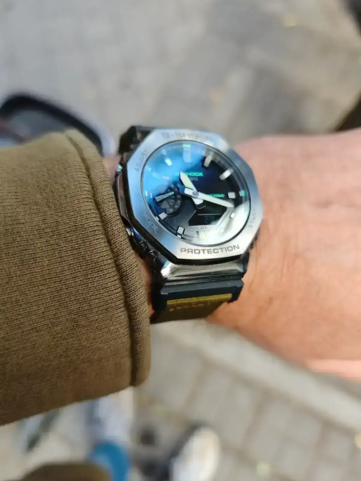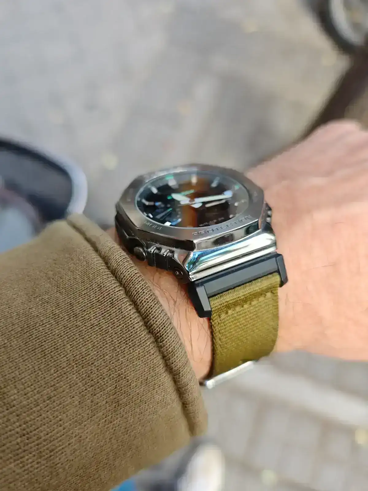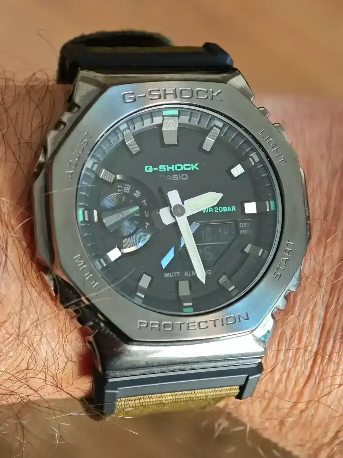 Se trata del GM-2100CB-3A, integrante de la serie Utility Metal de G-Shock. Todos me parecen interesantes, pero este con la caja en color algo oscurecido, pero no negro y la correa en verde me resultó tremendamente atractivo.
