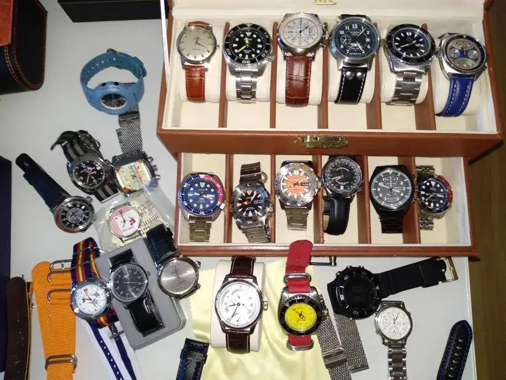 Mi primer Seiko cuarzo (comunión XD), Seiko digi tuna, Seiko kinetic, Longines máster retrogrado 44 mm, Seagull Barnail (precioso), Luch monoaguja, Vostok Komandiskie, Slava 2414, Vostok auto amphibian (submarino y buzo), el cuadrado es una estravagancia XDD no recuerdo que era, Seiko tortuga PADI, Seiko monster "vampire", Seiko 5 sports, Sturmanskie traveller (vostok 2431), Seiko military cuarzo, Seiko SKX009, Okeah, Orient Mako II, Aviator homenaje Piotr Nesterov (Poljot 3105), Galeno, Seiko Sumo, Omega vintage 50´s (heredado del abuelo y rehabilitado) y Casio G-shock