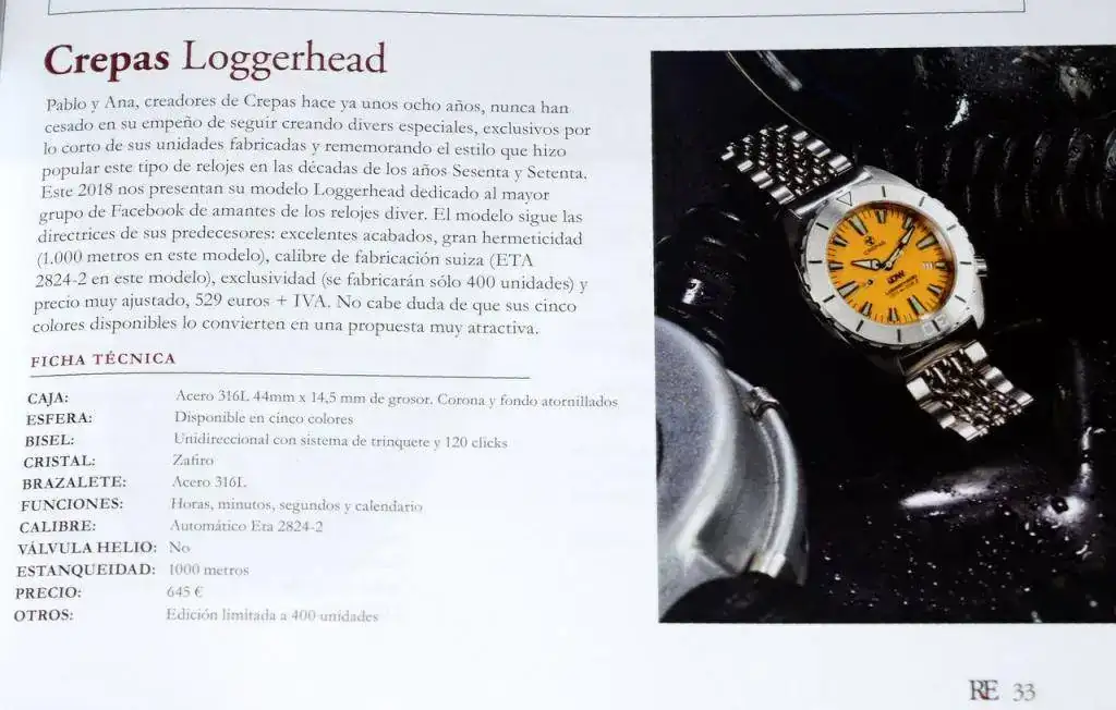 Es de los pocos Crepas, si no me falla la memoria, no inspirado directamente en un diver clásico y/o exótico, básicamente porque se trata de un encargo de DW. Va un poco en la línea del Scuba. No obstante los administradores de DW son muy fans de Doxa, o al menos esa es mi impresión. El Loggerhead esconde algún detalle que rinde tributo y no es sólo el beads of rice... Esos pequeños detalles compensan la parte más, digamos "comercial", que ofrece el reloj, sobre todo para los que están más acostumbrados a la línea argumental de Crepas previos.