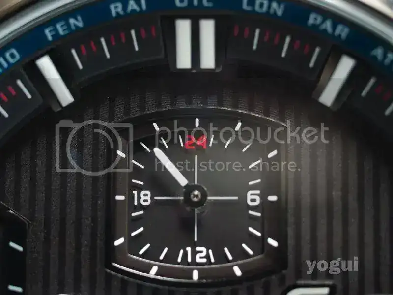 en el modo hora mundial, nos mostrara al principio la aguja de los segundos, la zona horaria elegida como segundo uso horario, para volver despues a marcar los segundos correctamente, para cambiar de zona horaria hay que sacar la corona y girar la misma para seleccionar la zona deseada.