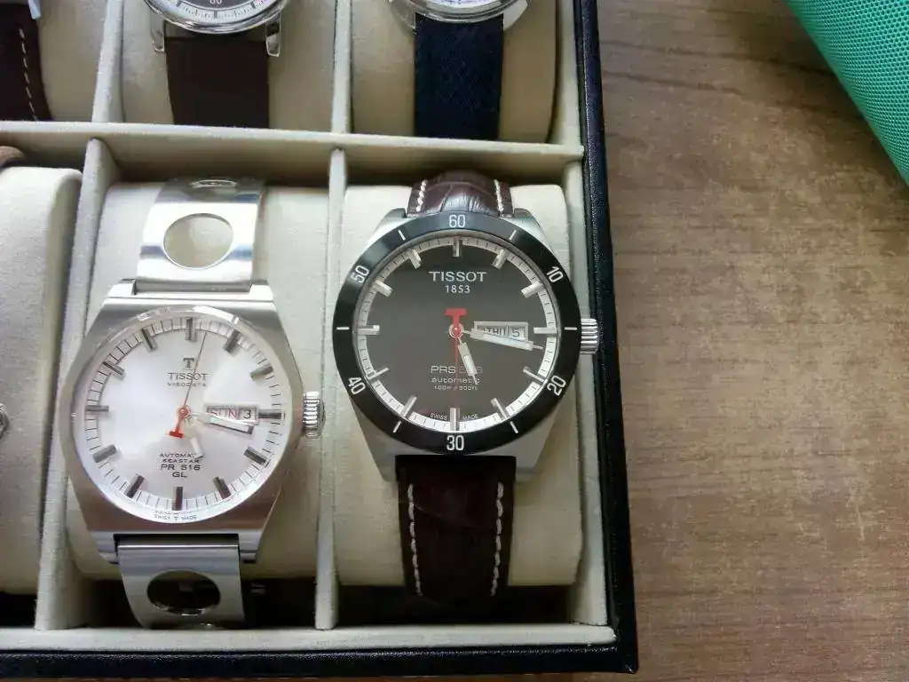 9 y 10. Tissot prs 516. El primero en entrar fué el negro, como regalo de graduación. El Seastar Visodate 516 lo ví después, y me encantó el color plata de la esfera y el armis rally, así que por qué buscar más excusas.