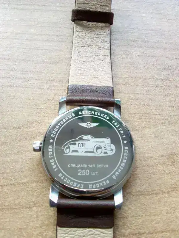 4. Luch monoaguja. Este Luch monoaguja es una edición especial de 250 piezas para un foro de relojes ruso, conmemorando la creación del Gaz GL1, el primer coche deportivo soviético. La tapa trasera tiene un gravado con la imagen de dicho coche.