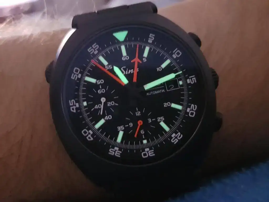 En este caso, caja de 40,5mm, también una valjoux 7750 que proporcionaba Eterna. Índices y agujas con tritio.