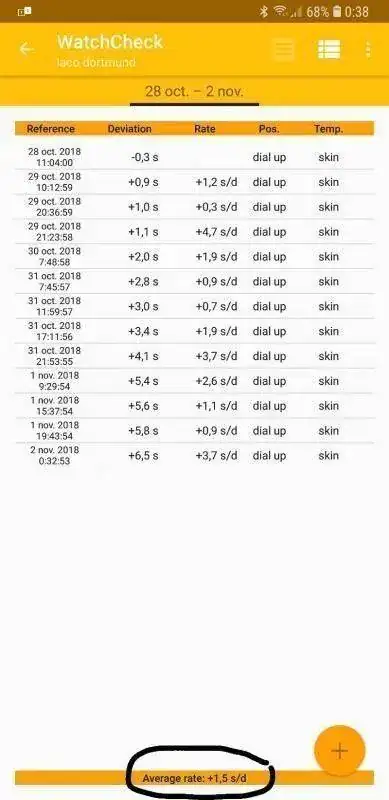 Después probé con la aplicación WatchCheck, también para Android, gratuita, que hace algo muy simple, pero efectivo: almacena registros (que realiza manualmente el propietario del reloj) cuando la aguja del segundero pasa por el cero y, comparando esas lecturas con las de sus relojes (NTP y GPS), obtiene la desviación media en segundos/día. El proceso es lento, pero seguro. Los posibles errores en la toma de los registros se minimizan al tomar numerosas muestras durante varios días y en las mismas condiciones. A mi reloj le ha salido un valor medio de +1,5 seg./día, lo cual creo que está bastante bien.