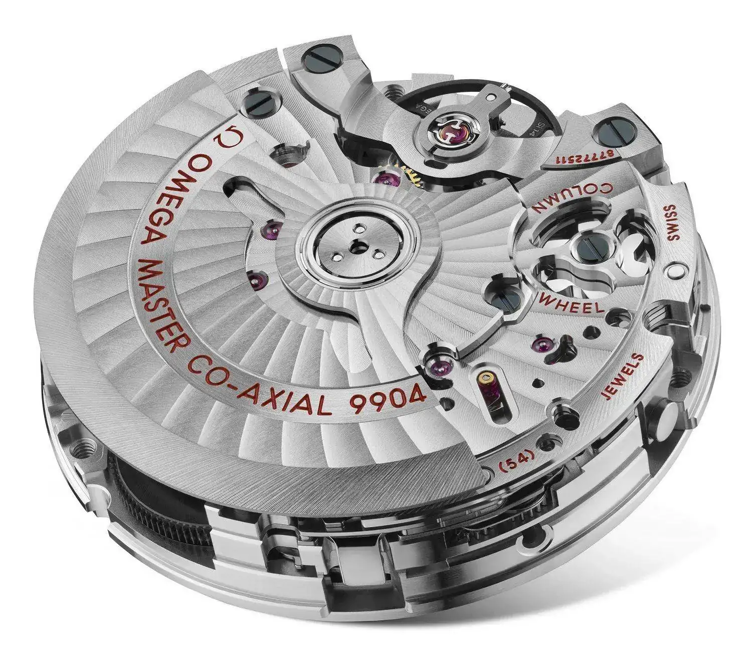 En el interior de este reloj se encuentra el calibre 9904 (evolución de la serie anterior de calibres 9300 de Ω): Cronógrafo automático con rueda de pilares y escape Co-Axial a 28800 alt/h u 8 Hz. Cuenta con 368 componentes, 54 Jewels , 2 barriletes en serie con una reserva de marcha de 60Hs, Certificado METAS, resistente a campos magnéticos hasta de 15000 gauss con espiral de silicio y acabado rodiado, con Côtes de Genève en arabesco.