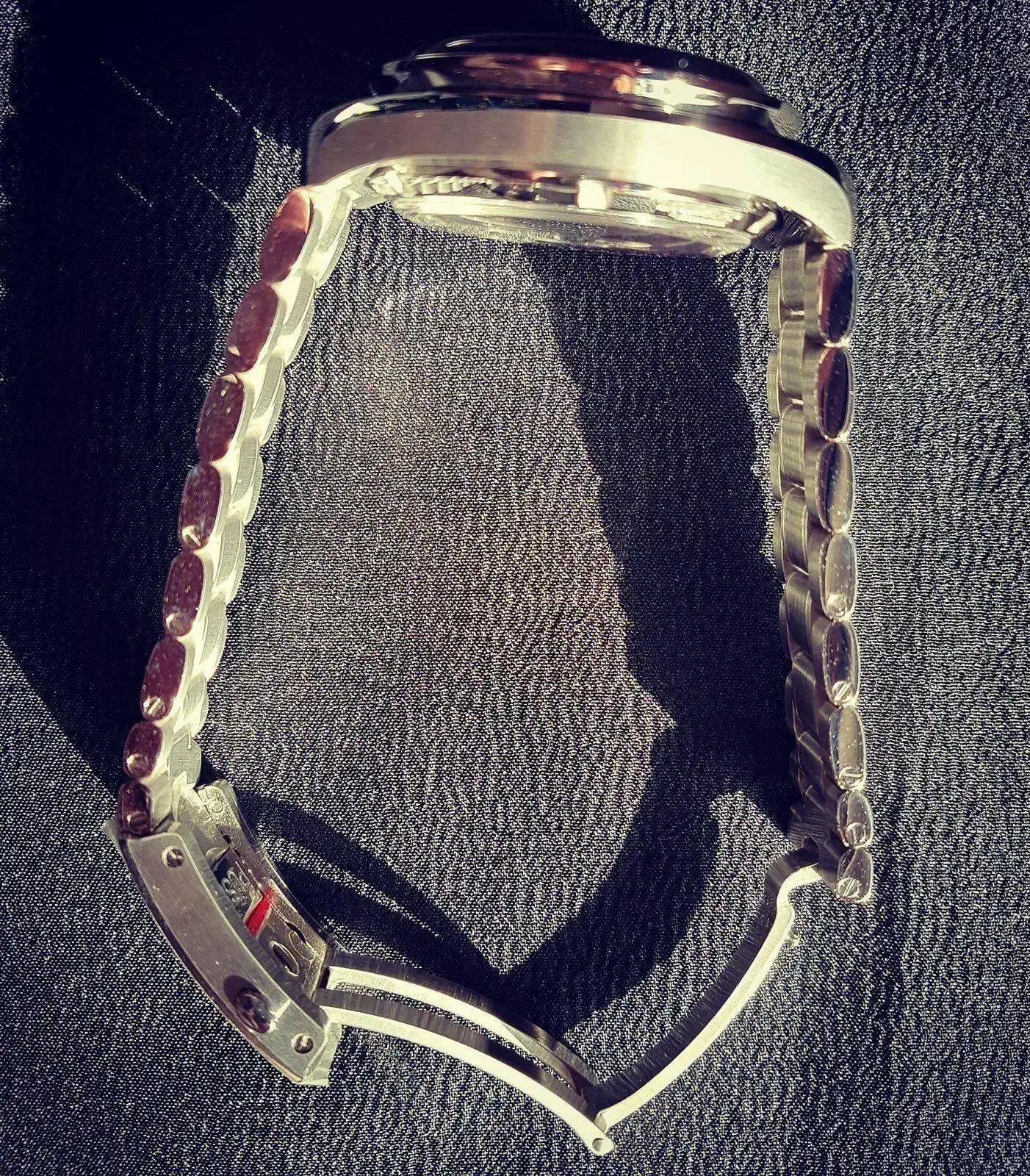 El cierre del brazalete tiene un microajuste deslizante muy práctico mediante el accionamiento de un botón en la parte interna del cierre (a la manera del Seamaster Diver-300M pero más corto) con un recorrido de unos 5 mm aproximadamente, muy adecuado para ajustar el reloj a la muñeca por los cambios de temperatura en invierno o verano por ejemplo.