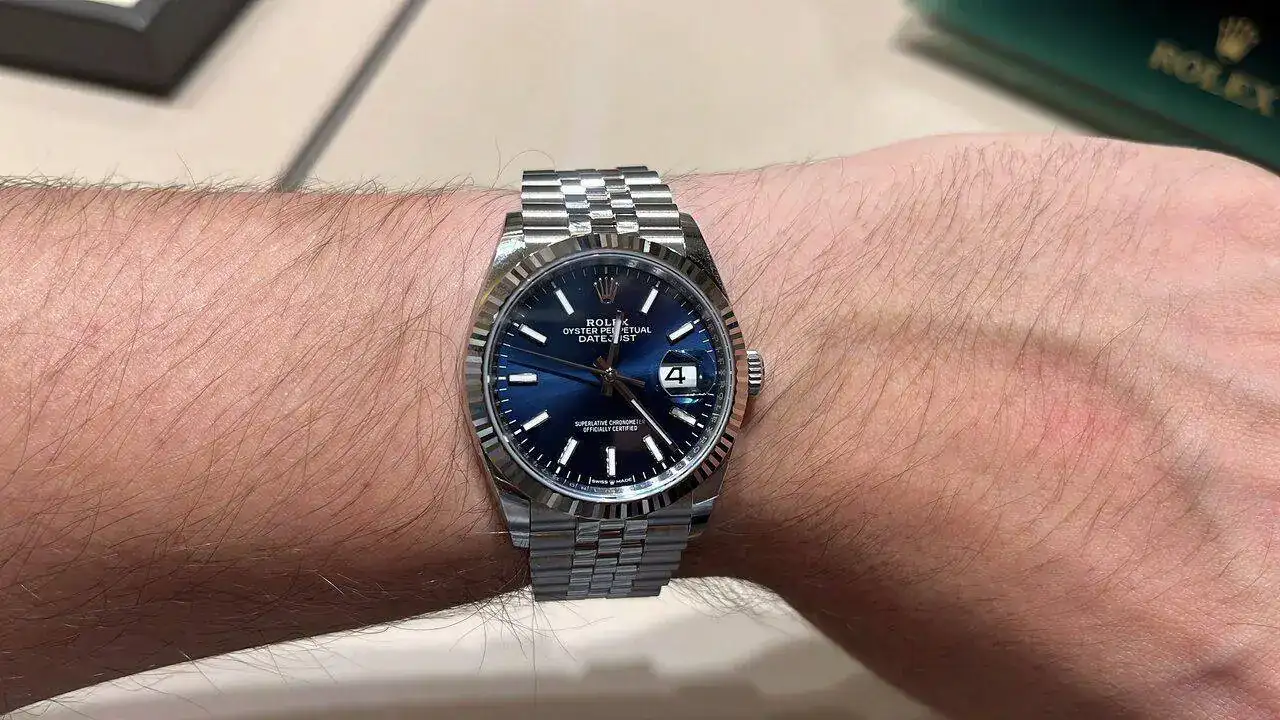 Este sábado recogí mi nuevo Datejust, no he tenido tiempo para poder hacerle mejores fotos pero ya pondré alguna más. Es el modelo clásico de 36mm con jubileé y bisel estriado. Muy cómodo con el brazalete y los 36mm clásicos de toda la vida del Datejust. Cada vez me gustan más estos tamaños y ya dudo que vaya a comprar algo de más de 40mm otra vez. El dial es una maravilla con ese azul y el bisel me encanta. Creo que es de las configuraciones más bonitas y versátiles de todas.