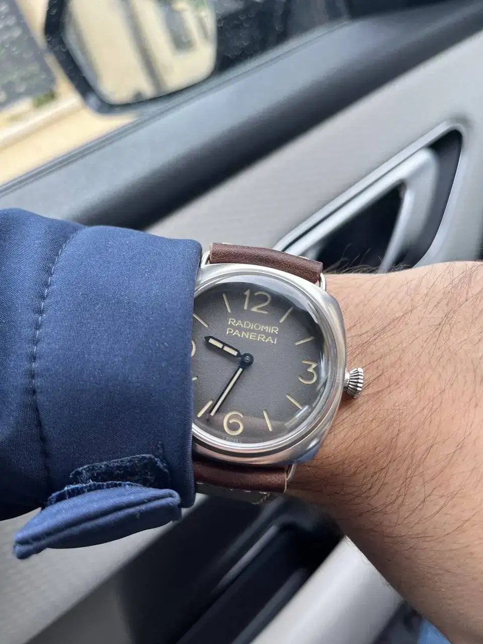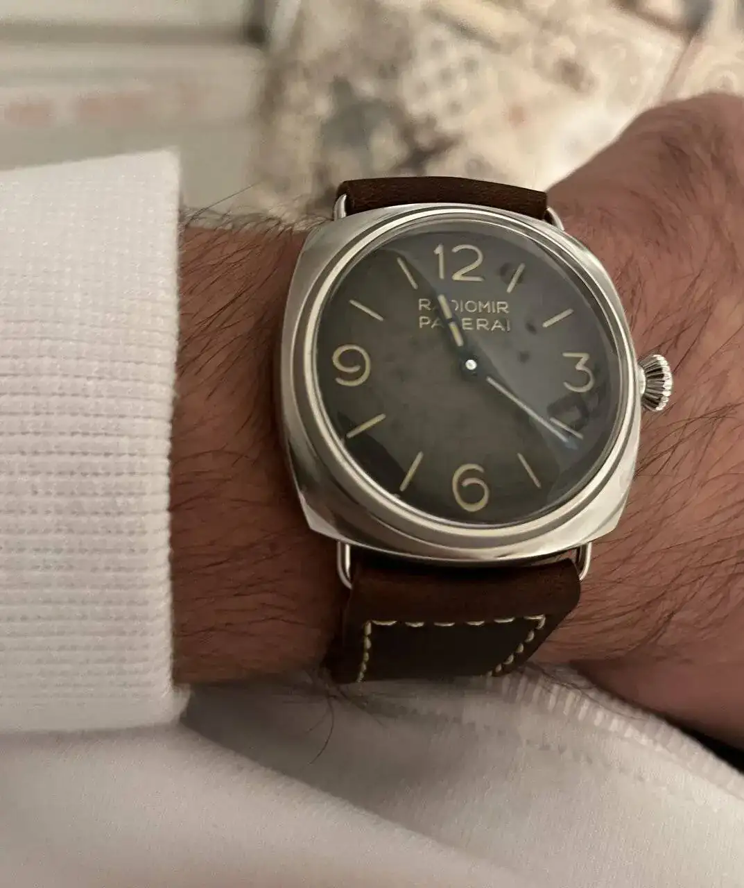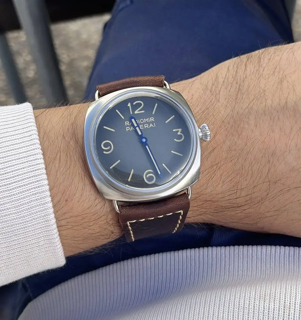 Entonces el otro día pude probarme este modelo y me quedé enamorado, el reloj lo tiene todo, dial limpio solo con su nombre y modelo, caja cepillada (esto me encanta, pero pulida también me gusta, pero esta es espectacular), agujas azules a fuego, cristal imitando el plexi, fondo a presión, calibre manufactura 3 días, correa espectacular envejecida, en fin, lo único malo es que es verdad que los 45mm se me quedan algo grandes, pero bueno teniendo una colección muy comedida (datejust 36mm, cartier tank medio, bb 39mm...) tenía ganas de este reloj aún quedándome grande, pero me costó un poco decidirme, por decir algo, creo que no se nota tan grande como otros relojes que puedan parecer más pequeños, yo si os gusta os recomiendo probarlo, pero es un reloj muy pasional, creo que si te gusta te fijas en eso. Tuve la esperanza de que lo sacaran en 42mm y bueno panerai lo ha sacado en 40mm, con 30wr y fondo a presión (sin sentido las cosas de Panerai).