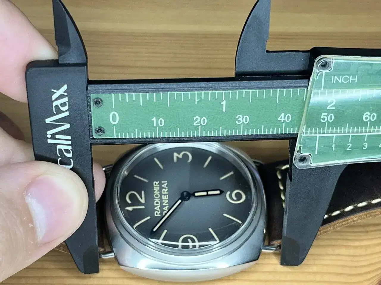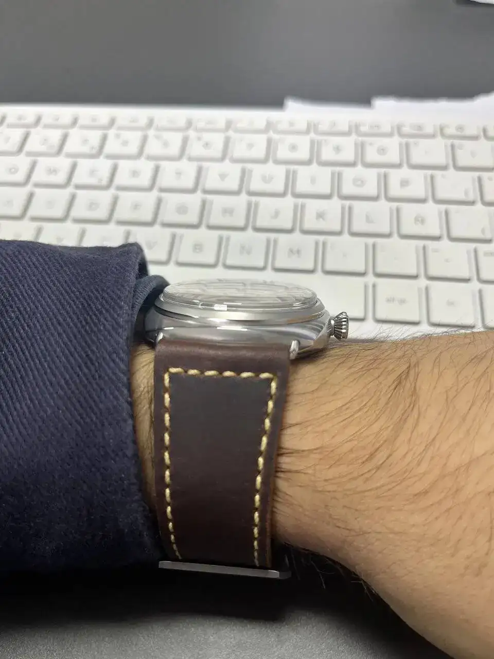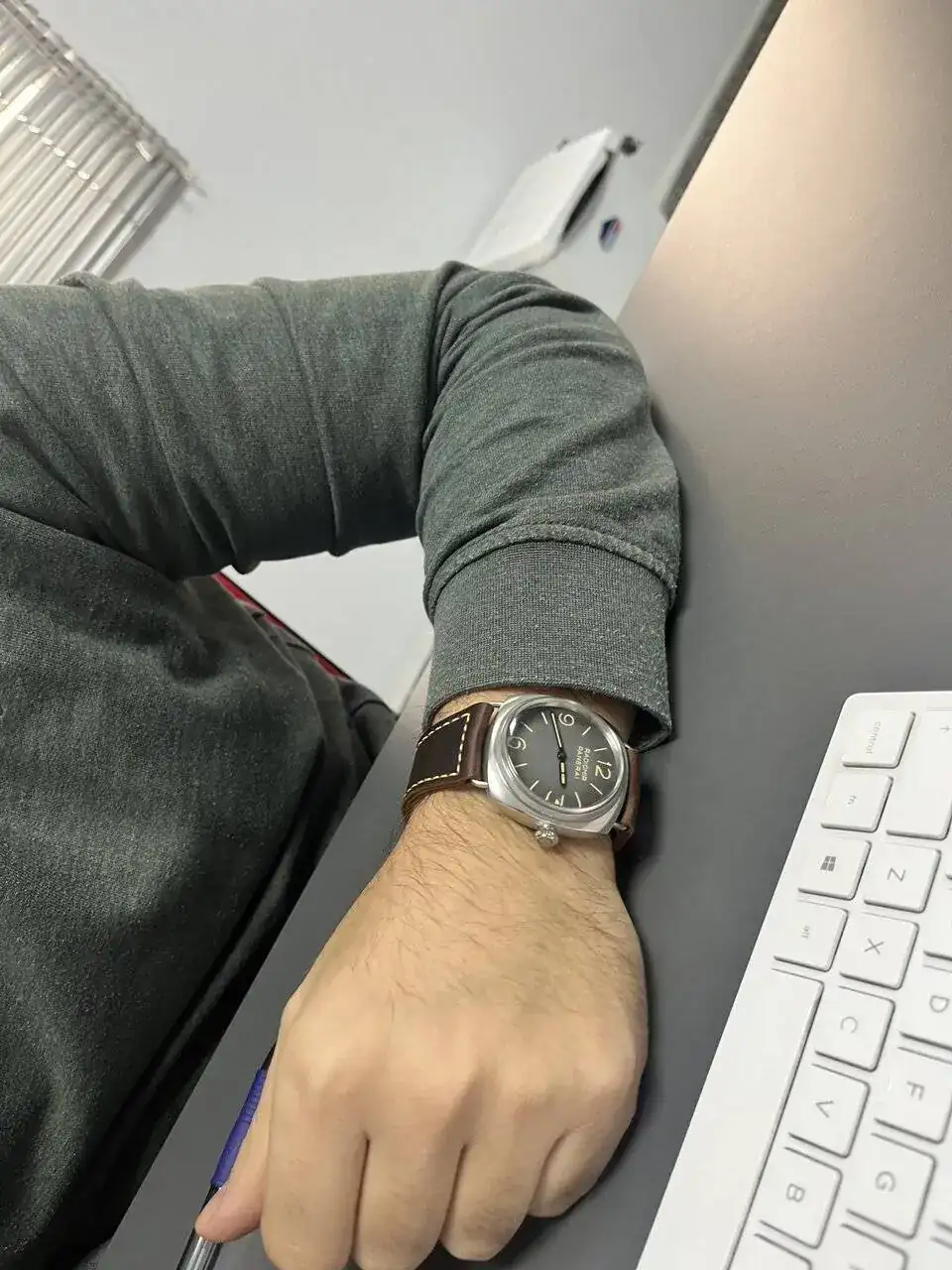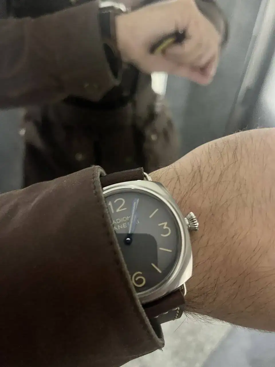 Entonces el otro día pude probarme este modelo y me quedé enamorado, el reloj lo tiene todo, dial limpio solo con su nombre y modelo, caja cepillada (esto me encanta, pero pulida también me gusta, pero esta es espectacular), agujas azules a fuego, cristal imitando el plexi, fondo a presión, calibre manufactura 3 días, correa espectacular envejecida, en fin, lo único malo es que es verdad que los 45mm se me quedan algo grandes, pero bueno teniendo una colección muy comedida (datejust 36mm, cartier tank medio, bb 39mm...) tenía ganas de este reloj aún quedándome grande, pero me costó un poco decidirme, por decir algo, creo que no se nota tan grande como otros relojes que puedan parecer más pequeños, yo si os gusta os recomiendo probarlo, pero es un reloj muy pasional, creo que si te gusta te fijas en eso. Tuve la esperanza de que lo sacaran en 42mm y bueno panerai lo ha sacado en 40mm, con 30wr y fondo a presión (sin sentido las cosas de Panerai).