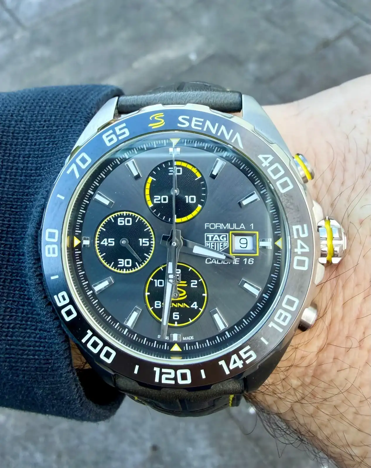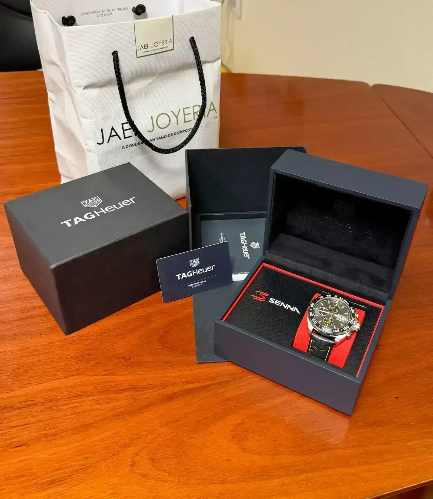Buenas a todos, pues presento mi nueva incorporación , después de estrenarme con el SEIKO Edición Limitada del 80 Aniversario de Naomi Uemura, como ya alguno me adelanto no sería el ultimo, como aficionado a la velocidad los TAG Heuer siempre me llamaron la atención y tenia ganas de un edición Senna, pero el que me gustaba ya no estaba disponible salvo que quedara por ahí alguna unidad y la he conseguido, ya se que no es un calibre manufactura pero el diseño me encanta y ya tengo mi primer crono, espero que os guste
