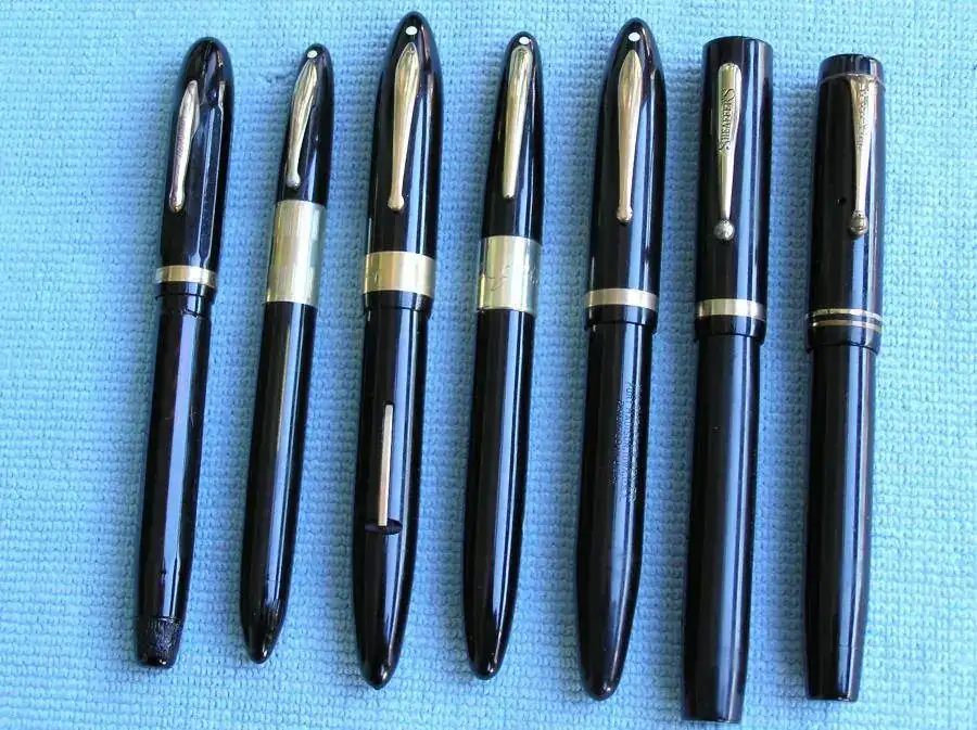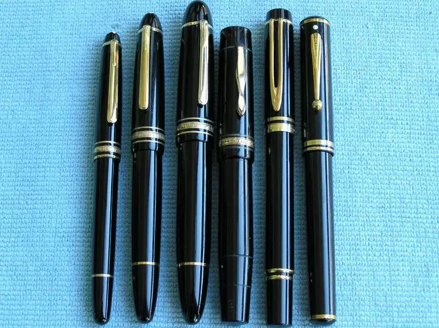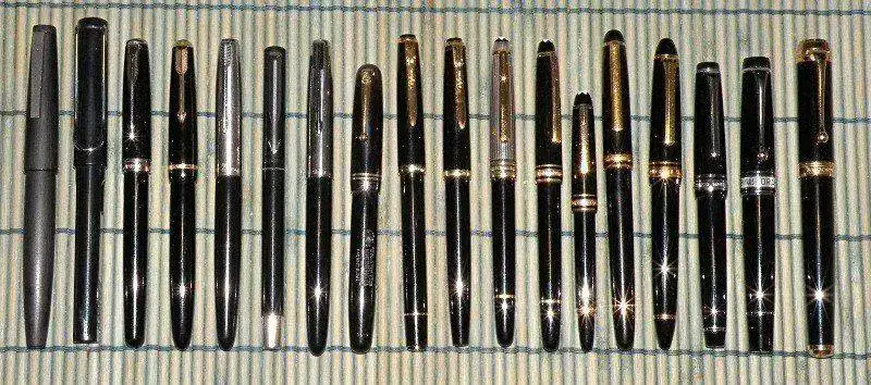 De izquierda a derecha: Lamy 2000, Lamy Safari, Parker Sonnet, Parker Duofold, Parker 21, Parker Vector, Hero 616, Swan 3260, Reform, Reform, Montblanc Solitaire Doué, Montblanc 144, Montblanc Mozart, Inoxcrom Caravel, Sailor 1911 Standard, Sailor Sapporo, Aurora Optima y Aurora Talentum.