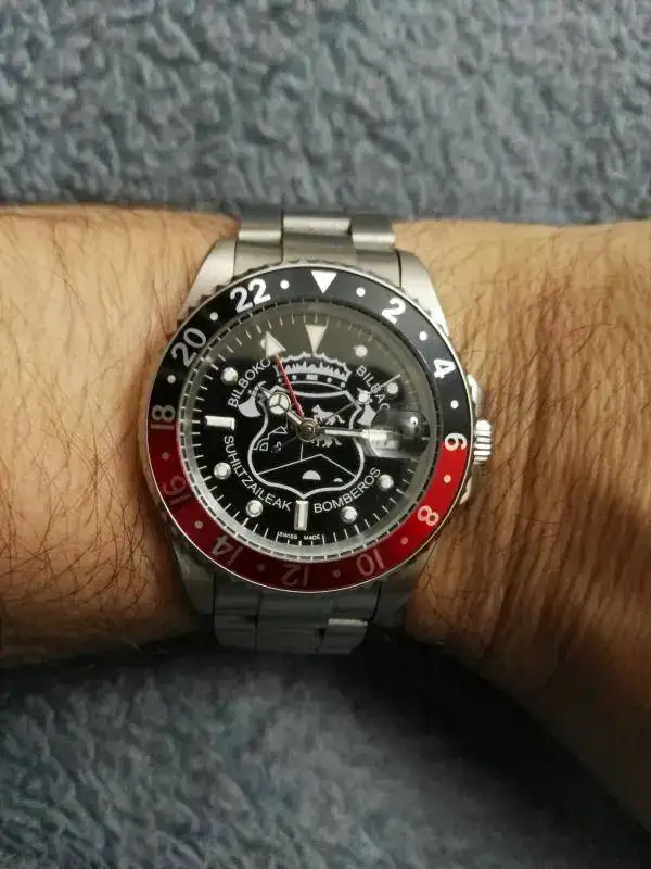 La corona esta firmada y roscada, ademas tiene un buen tacto, lo molesto es colocar la aguja GMT, que es real e independiente pero no esta sincronizada con la horaria para que no marquen las dos en punto, así que hay que ajustarla como mucho mimo, ademas va un poco como floja, con lo que lleva un ratito ajustar la aguja GMT. Al parecer el movimiento es un Mingzhu DG 3804B, y trabaja a 3 Hzs, dispone de 45 horas de reserva de marcha y 21 rubis; en mi caso viene muy bien ajustado así que de momento contento con el.