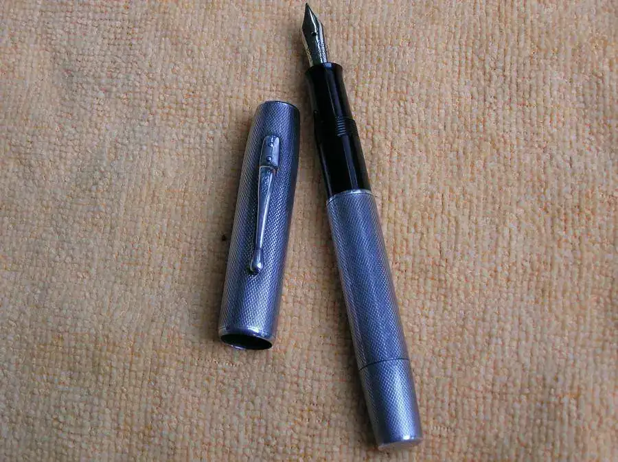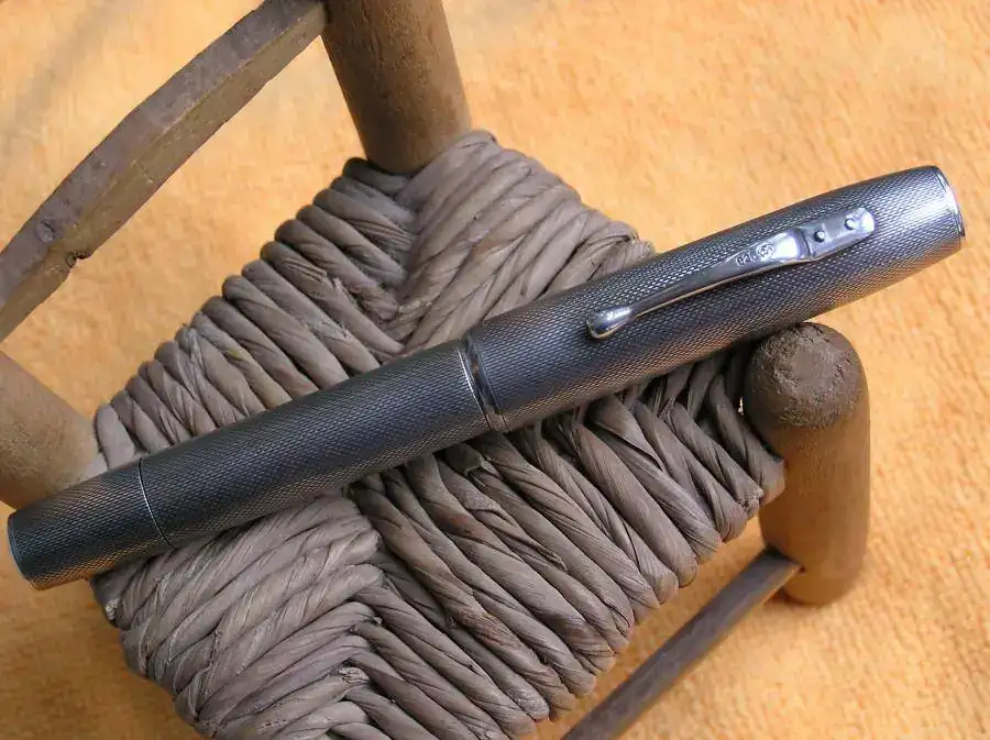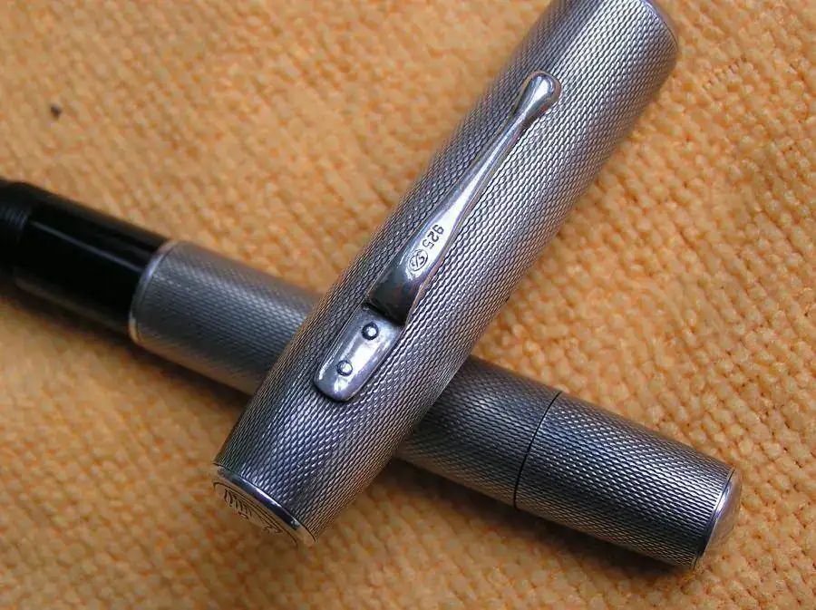 Es de plata y tiene un tamaño parecido al de la Pelikan M400 aunque es algo más gruesa.