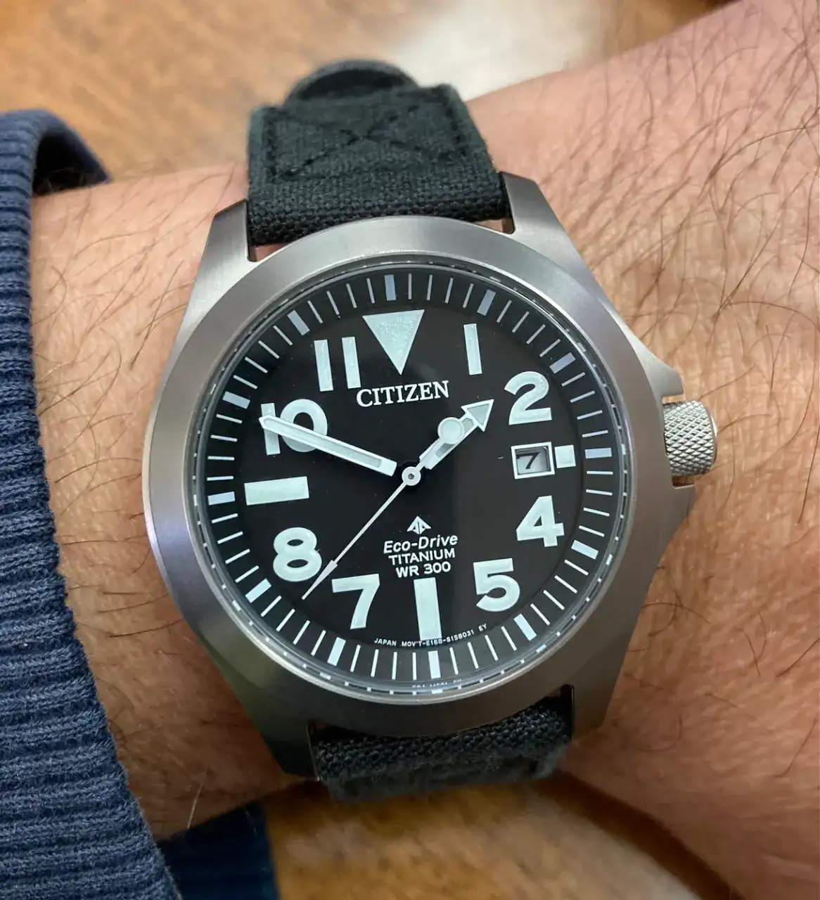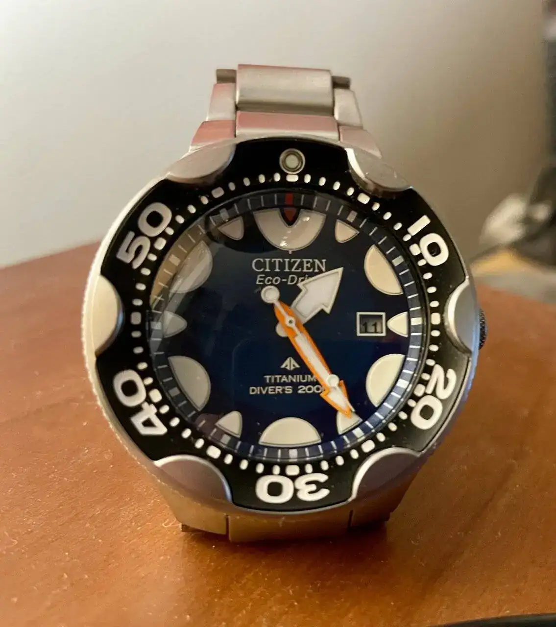 Y por último uno con menos historia pero también un buen reloj como todos los Citizen. El Marinaut C-460, un anadigi de 2005 completísimo y muy legible y cómodo. Tiene crono, cuenta atrás, dos alarmas con distinto sonido, ciudades del Mundo, cristal de zafiro y WR. 100M. Además como todos los analógico-digitales tiene la ventaja de que siempre se ve la hora con las otras funciones. En este caso las pantallas son muy buenas, no producen sensación de saturación de información, no molestan nada, pero cuando quieres ver su información la ves perfetamente. Además tiene un lumen muy bueno, que sigue aguantando toda la noche con casi 20 años, y retroiluminación en las pantallas, lo que le falta a muchos Casio anadigi. Es muy chulo encender la luz del reloj en la oscuridad, y verla junto con el lumen. Lo dicho, un reloj completísimo. Su estética es muy diferente, muy de la época, un poco orgánica y con el brazalete integrado, y unas líneas envolventes, a mí me gustó también por eso.