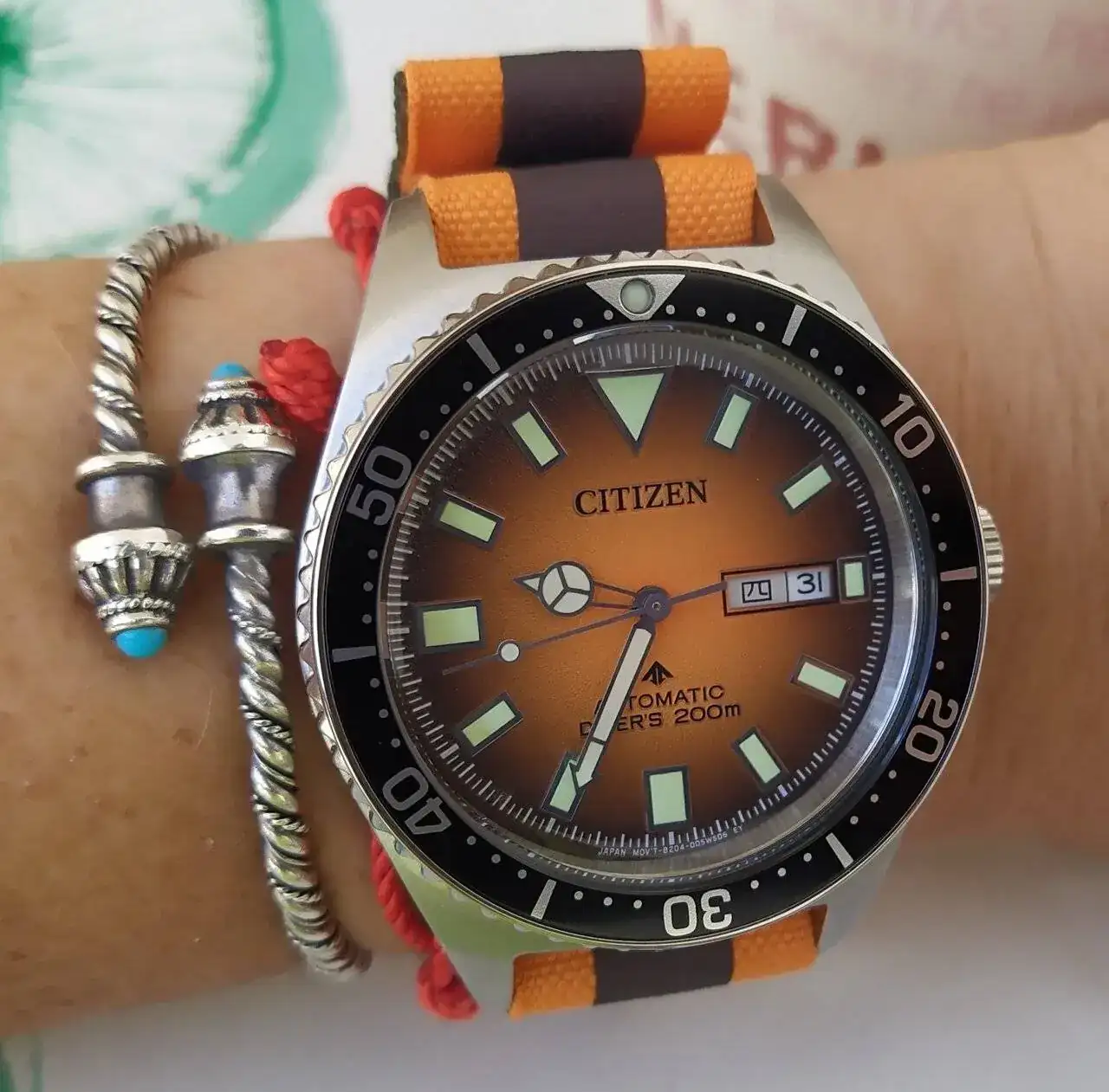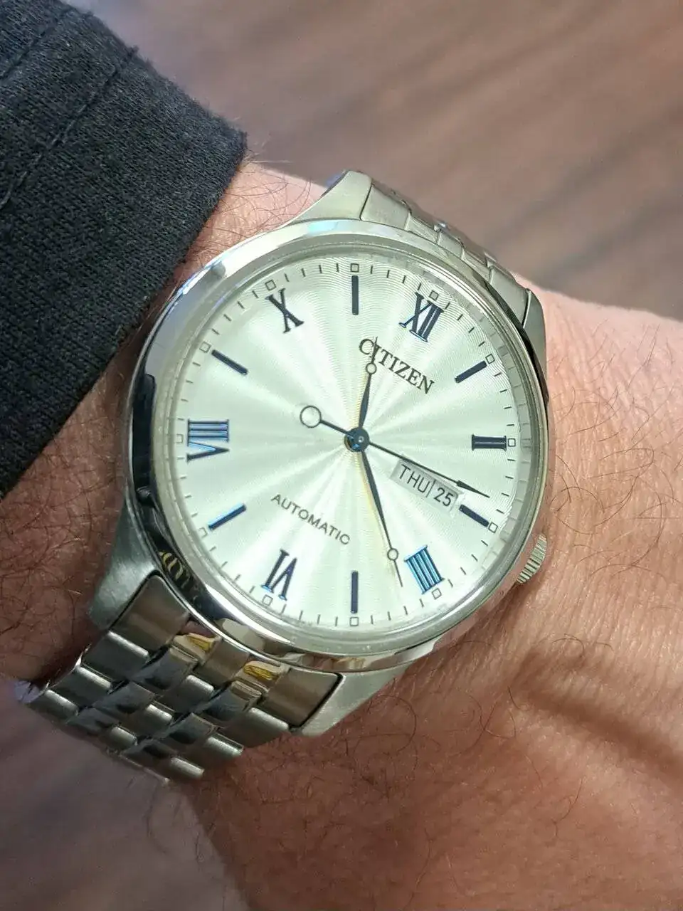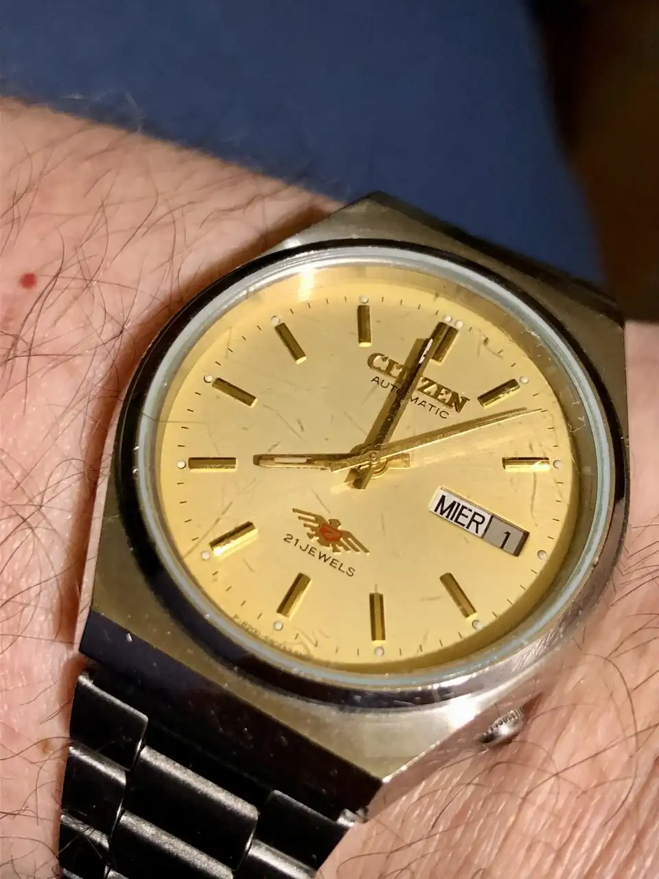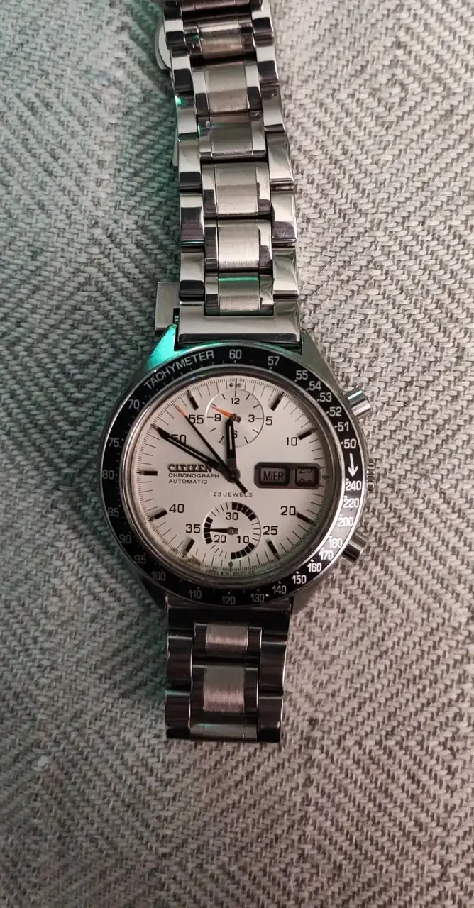 Este es el primer citizen que compré....Un modelo para el mercado asiático económico pero bien terminado, con un calibre básico y fiable, una esfera nacarada con rayos de sol que en vivo luce espectacular , índices y agujas con un reflejo azulado muy bonito, y con cristal de zafiro...