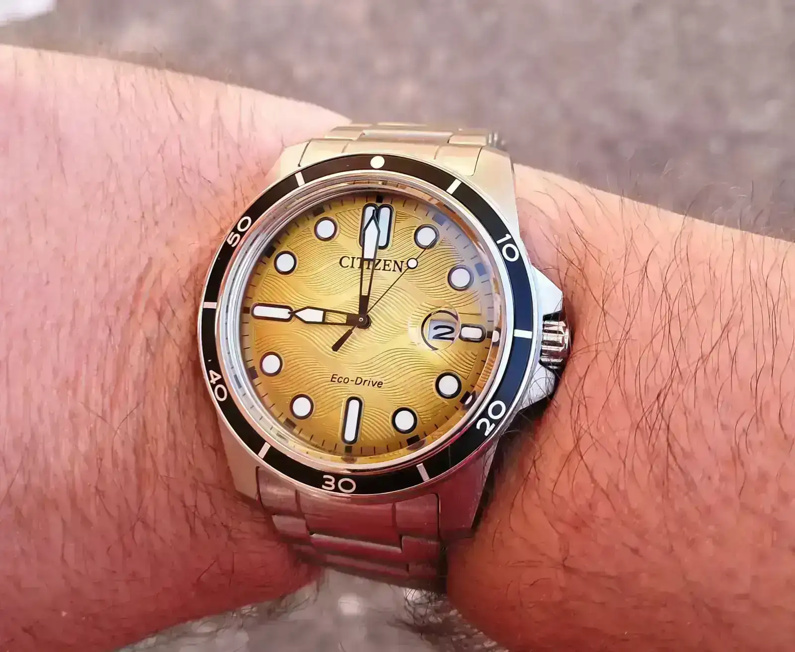 muy bonito reloj...amarillo?dorado? una bella mezcla!