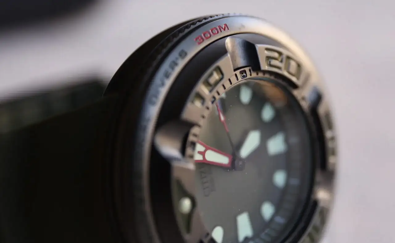 Terminando con los calibres de cuarzo de los 90, tampoco podía faltar un Citizen 6850. Es un calibre multifunción típico de la época muy completo, y a mí me encanta su forma de funcionar. Otro reloj que ha tenido mucha gente, fue otro gran éxito de Citizen, y en forma de Miyota 6W50 se vendió también en muchas marcas. Es impresionante el buen diseño que tiene un movimiento de estos, para ser fácil de utilizar con tantas funciones siendo relojes de agujas y no digitales. Me gusta mucho la doble alarma de estos relojes, una programable para que suene el mismo u otros días, y la otra de acceso rápido para que te avise de algo en un rato; además de contar con distintos tonos de alarma, con sonidos más largos o más cortos. Además es un calendario anual, indica el mes del año en que estás además de la fecha, diferenciando los meses de 30 o 31 días. Solo le falta distinguir los febreros. Crono, cuenta atrás, alarma, doble huso horario, este movimiento no tiene la calidad del 3510, pero es muy completo y también es duradero. Este mío además tiene bisel giratorio como los diver y es un WR. 100M, más completo imposible. Lo compré en estado NOS, con toda su dotación de manual, etiquetas, su caja, fue como un viaje en el tiempo. El tacto de uso es perfecto.