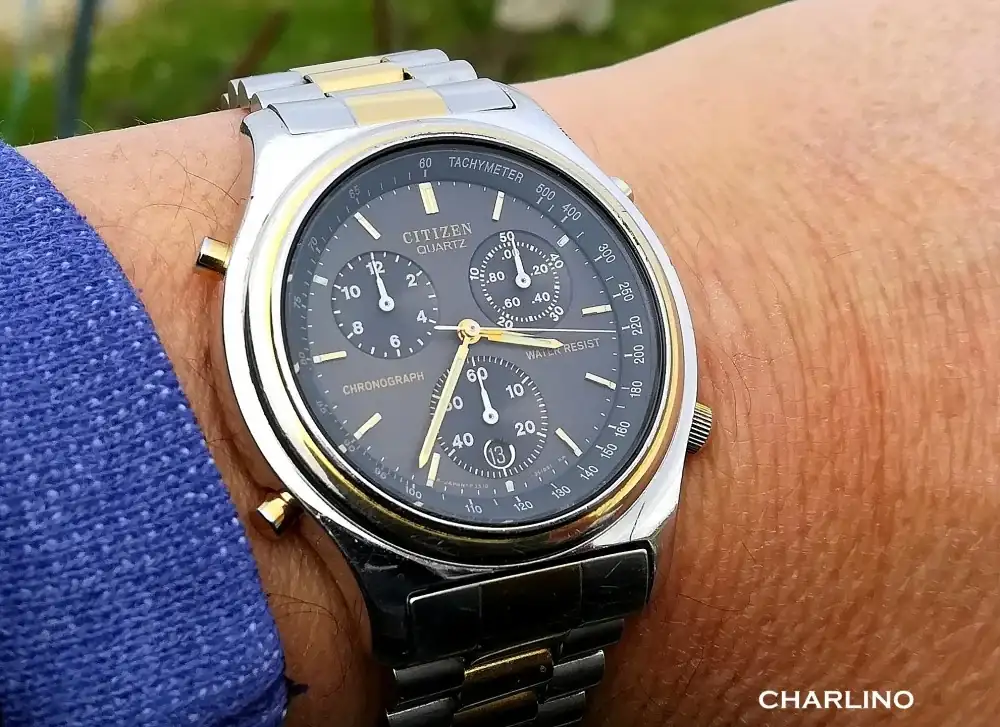 Cambio de tercio, volvemos a los relojes de cuarzo. No puede faltar el 3510, uno de los mejores calibres cronógrafo de cuarzo analógicos que ha habido. En la época dorada de este tipo de relojes, el 3510 fue la respuesta de Citizen al Seiko 7A28/38/48, primer cronógrafo de cuarzo analógico de la historia. El Seiko tenía mucha calidad, un movimiento metálico totalmente reparable montado sobre 15 rubís y con ajuste de la marcha. Citizen tenía que sacar algo bueno de verdad, y sacó a finales de los 80 el 3510/30/60/70, un movimiento de cuarzo también con una construcción metálica de calidad, reparable, montado sobre rubís y hasta con rueda de pilares, pero además con una electrónica más avanzada y algunas funciones adicionales como alarma y cuenta atrás. La alarma tiene un sonido de grillo precioso, la cuenta atrás se programa de forma directa y muy rápida y el crono cuenta hasta 12 horas, a diferencia de solo media hora en el más clásico Seiko. De paso, este movimiento se fabricó en gran cantidad bajo el nombre Miyota 3S10 y Citizen lo vendió a marcas de todo el mundo, tanto caras como más económicas, en este caso en sus gamas más altas, y esto hizo posible que mucha gente pudiese disfrutar de verdaderos relojazos a precios no tan caros como la calidad de este calibre podía haber supuesto. En los 90, la normalización del uso del titanio y la generalización del Miyota 3S10 hicieron posible que mucha gente pudiese tener relojes excelentes a buenos precios gracias a Citizen.