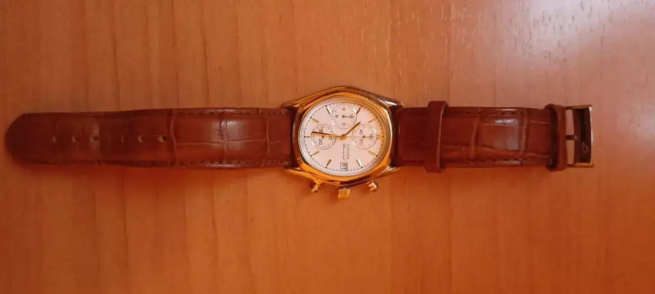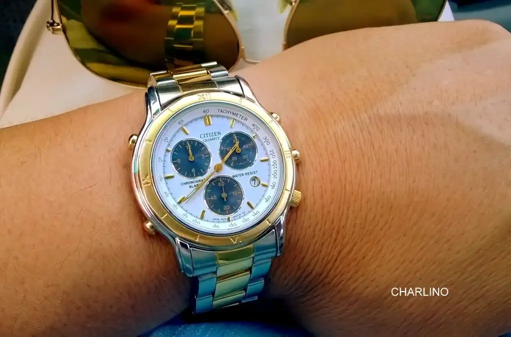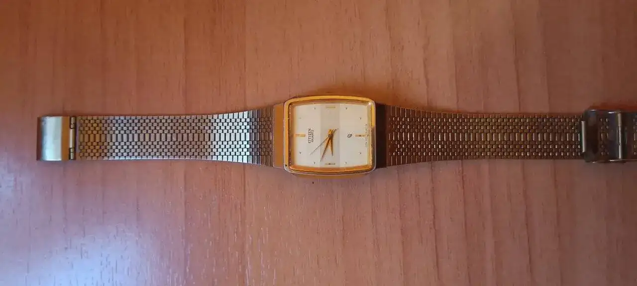 Y el más antiguo de la familia, Citizen 3560 de 1990. Es como el 3510 pero sin alarma. Lleva su brazalete tipo President original, y tiene las partes doradas algo borradas, son 34 años de uso, pero funciona perfectamente y sigue siendo muy bonito y comodísimo.