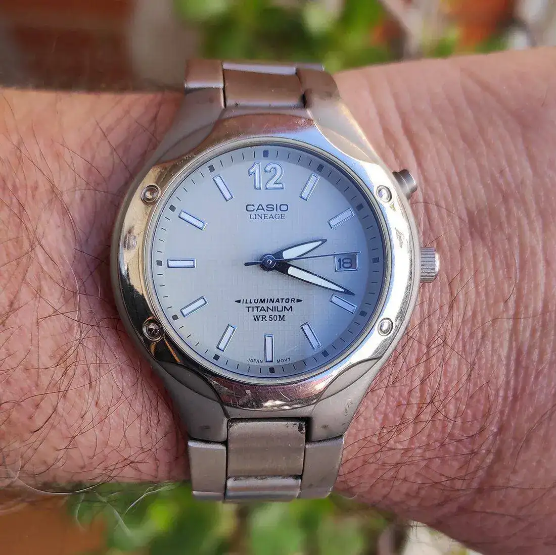 No sabía que Casio tenía su "Indiglo" propio. Ojalá hicieran más modelos analógicos con él.Pues hoy, modesto pero particular Casio. Caja de Titanio y cristal, frente a las habituales resina y plástico (hablamos de hace 20 años) e "Illuminator" (esfera EL al más puro estilo Indiglo©). Aunque la propia web de la compañía clama "The Casio Lineage is solar, radio control watch collection by Casio", esto no es así exactamente...